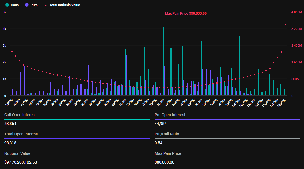 De gegevens tonen ook aan dat het maximale pijnpunt voor deze vervallende opties $80.000 is. In crypto-optiehandel is het maximale pijnpunt de koers waarbij de meeste contracten waardeloos aflopen. Hier zal het actief de grootste financiële verliezen voor houders veroorzaken.