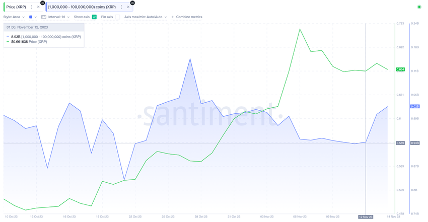 De Santiment grafiek hieronder laat zien dat whales (wallets met 1 miljoen tot 100 miljoen XRP) hun koopdruk verhoogden toen de koers op 12 november $0.65 bereikte.