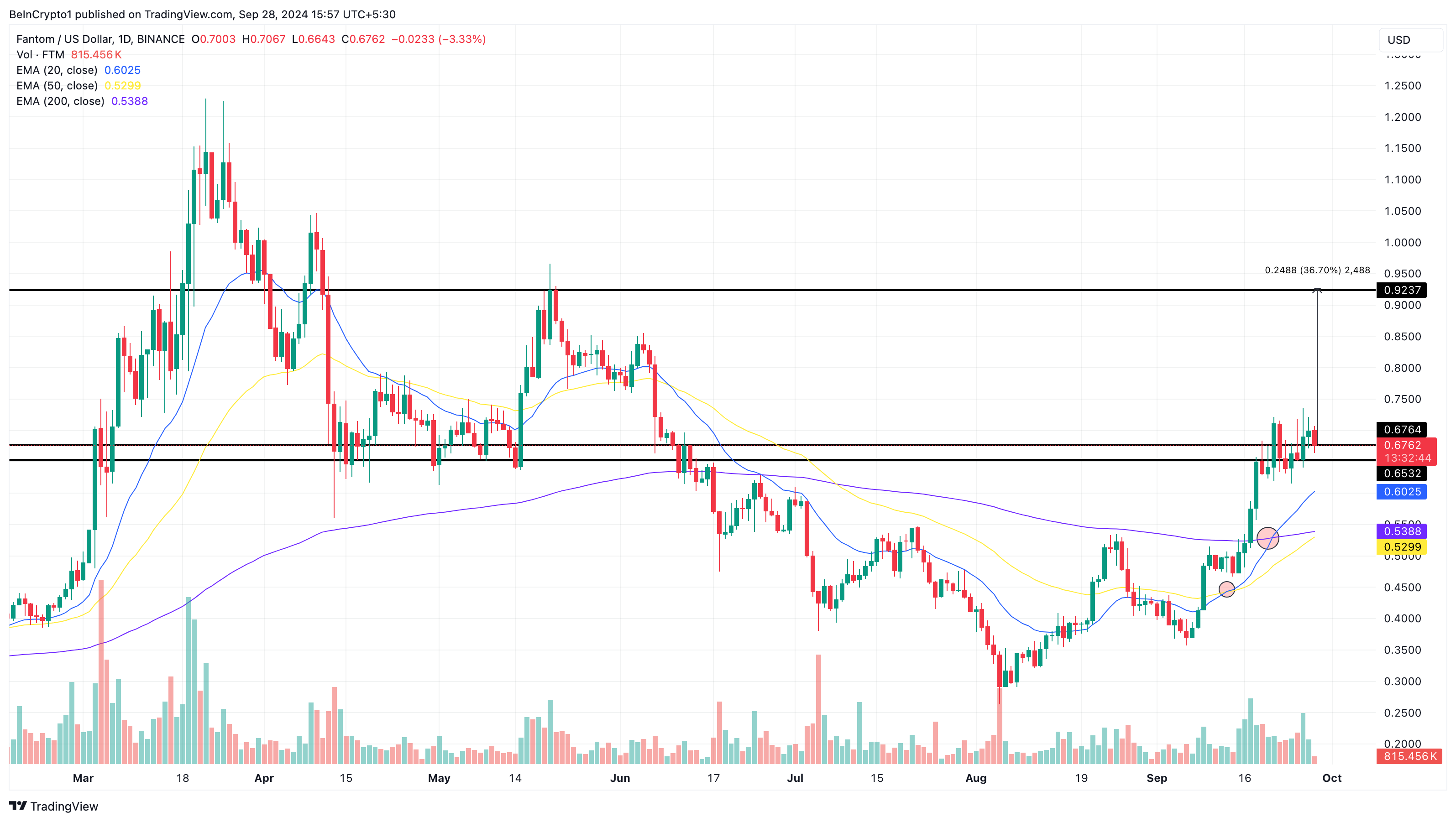 Volgens de dagelijkse grafiek staat de koers van FTM op $0,67, met de Exponential Moving Average (EMA) die bullish signalen afgeeft. Zoals hieronder weergegeven, heeft de 20 EMA (blauw) de 50 EMA (geel) gekruist. Bovendien is de 20 EMA voor het eerst in lange tijd boven de 200 EMA (paars) gestegen, wat aangeeft dat er een consistente rally aan de gang is.