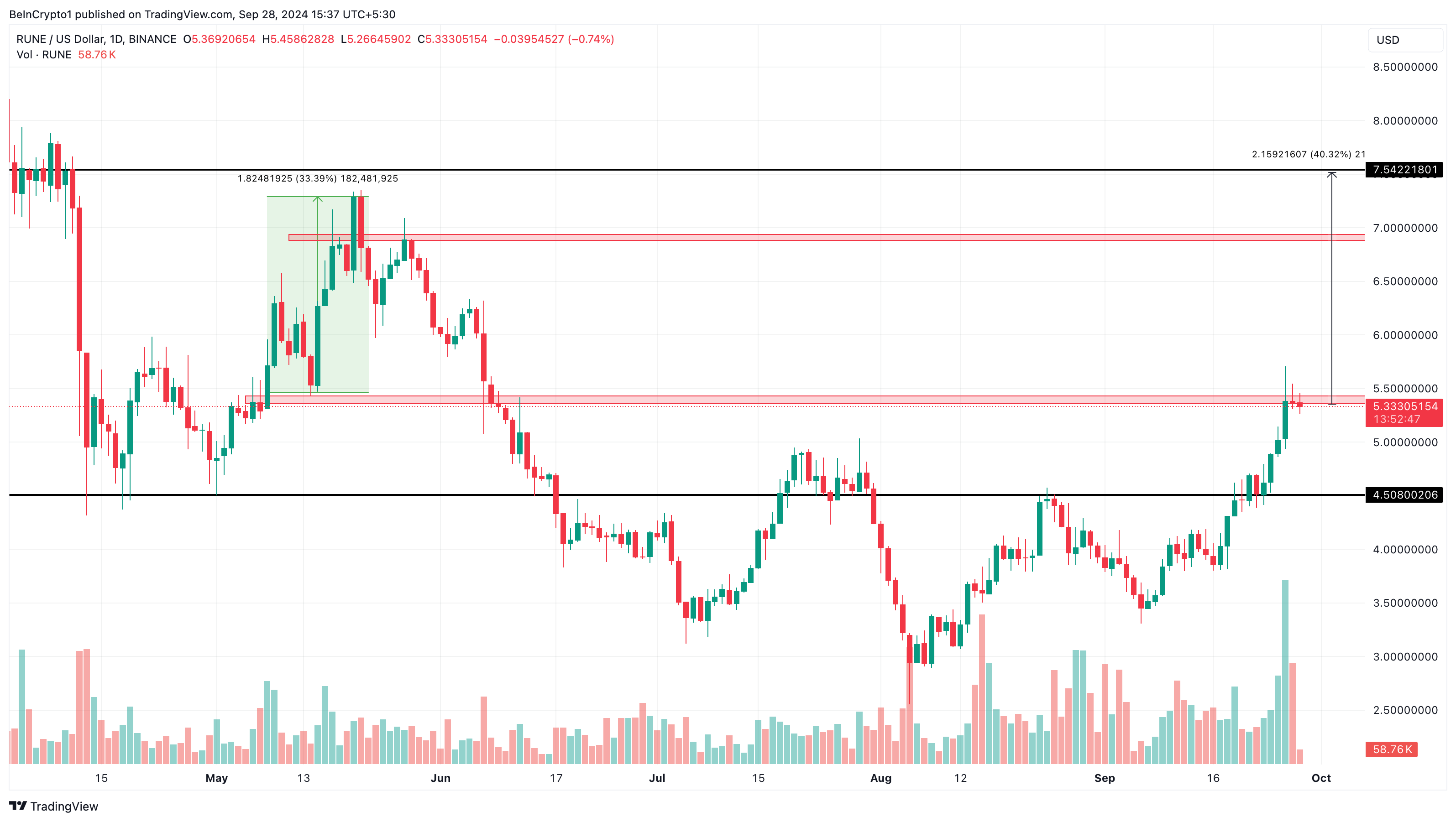 Hoewel de RUNE koers momenteel op $5,34 staat, lijkt het een obstakel te hebben ondervonden bij $5,40. Dit kan leiden tot een korte terugval, vergelijkbaar met wat in mei gebeurde. Bovendien zou de token een herhaling van de eerdere prestatie kunnen vertonen en de koers kunnen laten stijgen naar $7,28.
