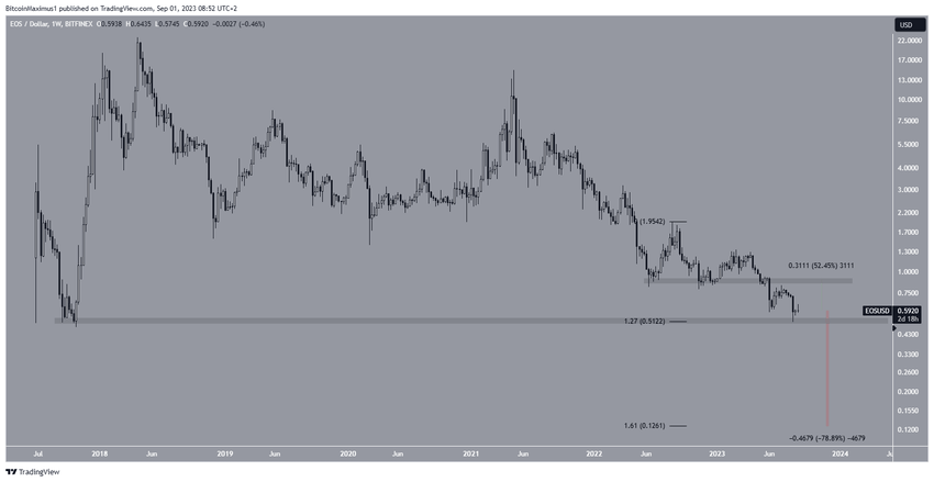 De EOS koers is sinds het creëren van een lagere high in juni 2021 gedaald. In het afgelopen jaar stuiterde de prijs verschillende keren op de $0,90 horizontale steunzone. De uitbraak in juni zorgde er echter voor dat het steungebied niet meer van toepassing was. De daling leidde tot een bijna historisch dieptepunt van $0,50 op 17 augustus.