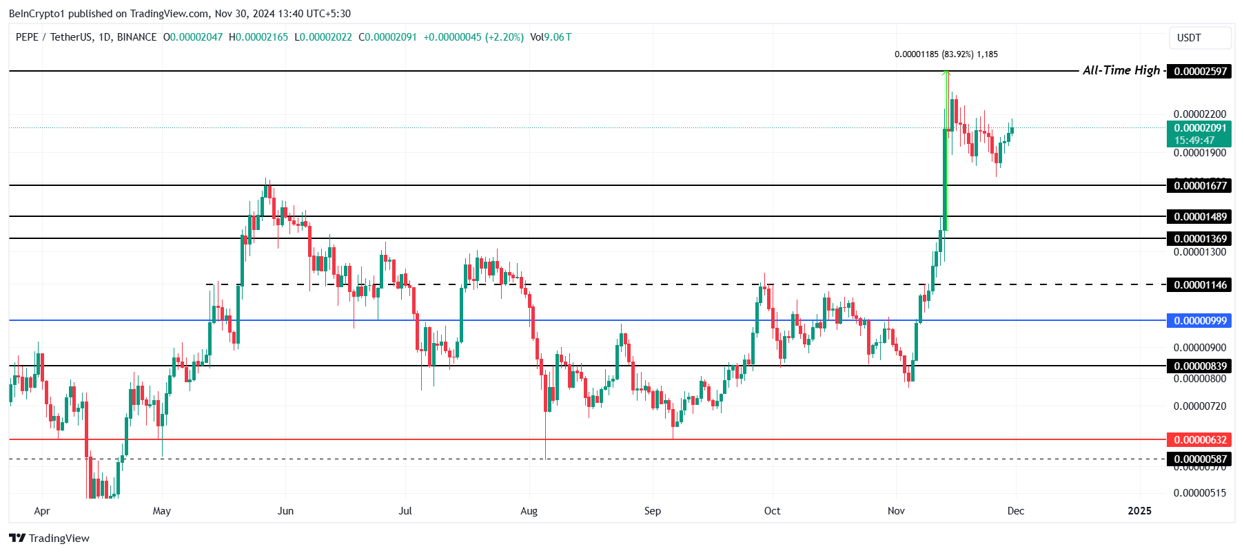 PEPE zag een onverwachte stijging in november, met een klim van bijna 84% binnen slechts 48 uur. Deze snelle toename hielp de meme coin een all-time high (ATH) van $0,00002597 te bereiken, wat investeerders verraste en hernieuwde interesse in de coin opwekte. De prestaties benadrukken de volatiele aard van meme coins in de cryptomarkt.