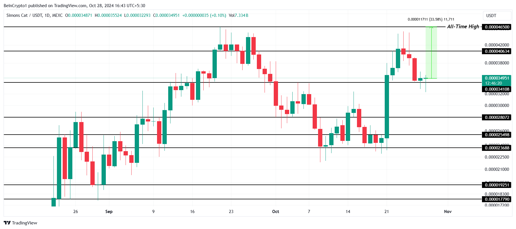 CAT staat momenteel 33,5% onder zijn all-time high van $0,00004650. Om dit niveau te bereiken, is sterk bullish momentum cruciaal. Dit zou de meme coin kunnen positioneren voor nieuwe records, wat de interesse en potentiële investeringen in de markt kan versterken.