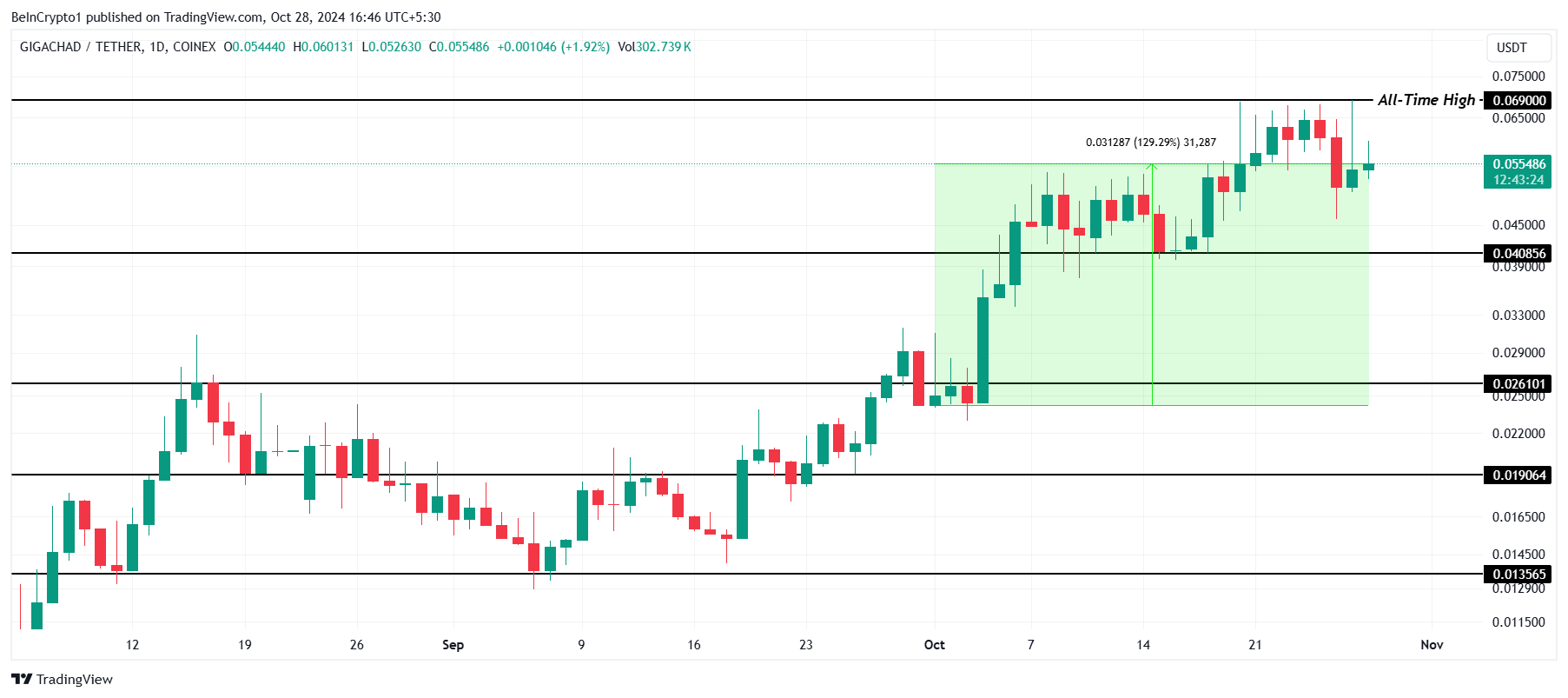 De GIGA koers steeg 129% afgelopen maand en bevindt zich nu op $0,055, met twee recente all-time highs, de laatste op $0,069. Deze stijging verhoogde GIGA’s populariteit binnen de meme coin-community.