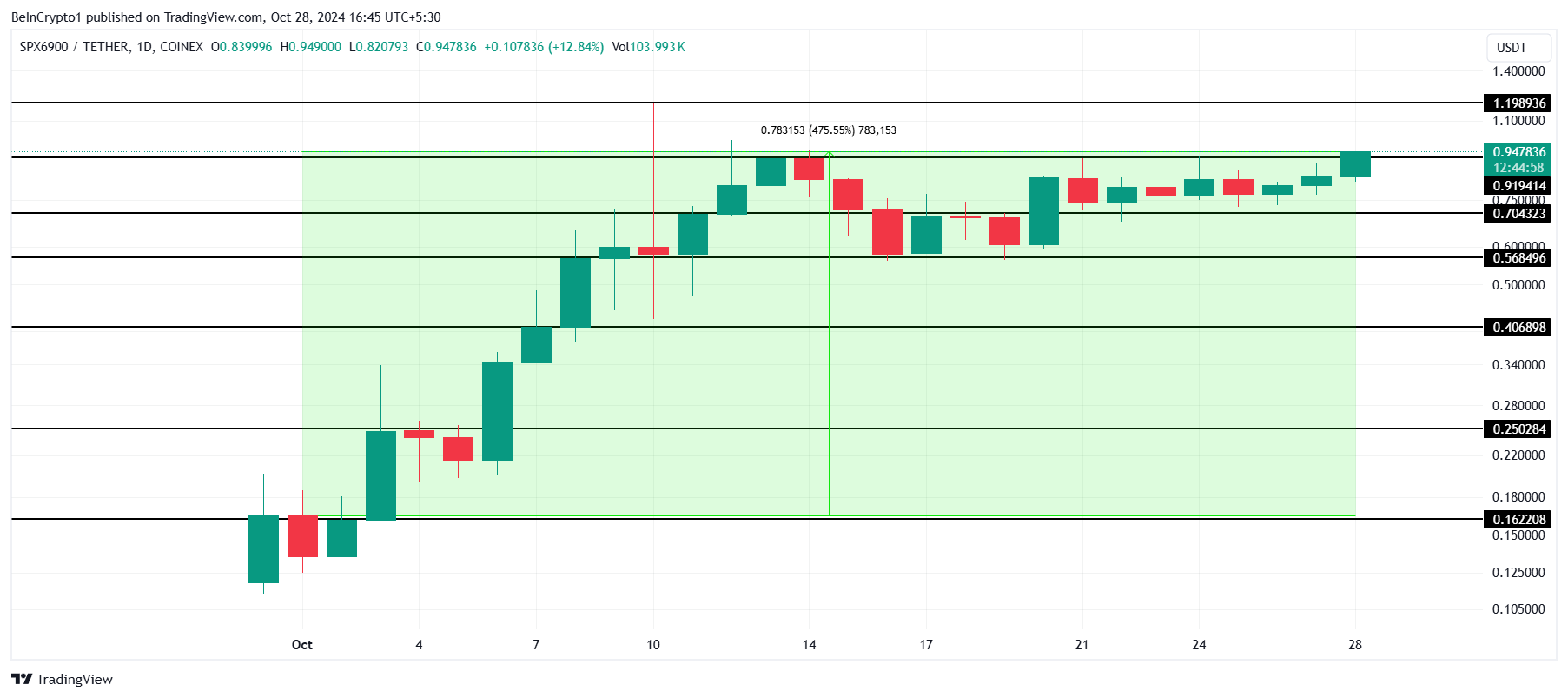 SPX is gestegen met een indrukwekkende 475% in de afgelopen vier weken, waardoor het een van de best presterende meme coins van de maand is. Deze snelle stijging heeft SPX naar een nieuwe all-time high (ATH) van $1,198 gebracht, wat aanzienlijke aandacht van investeerders en meme coin liefhebbers heeft getrokken.