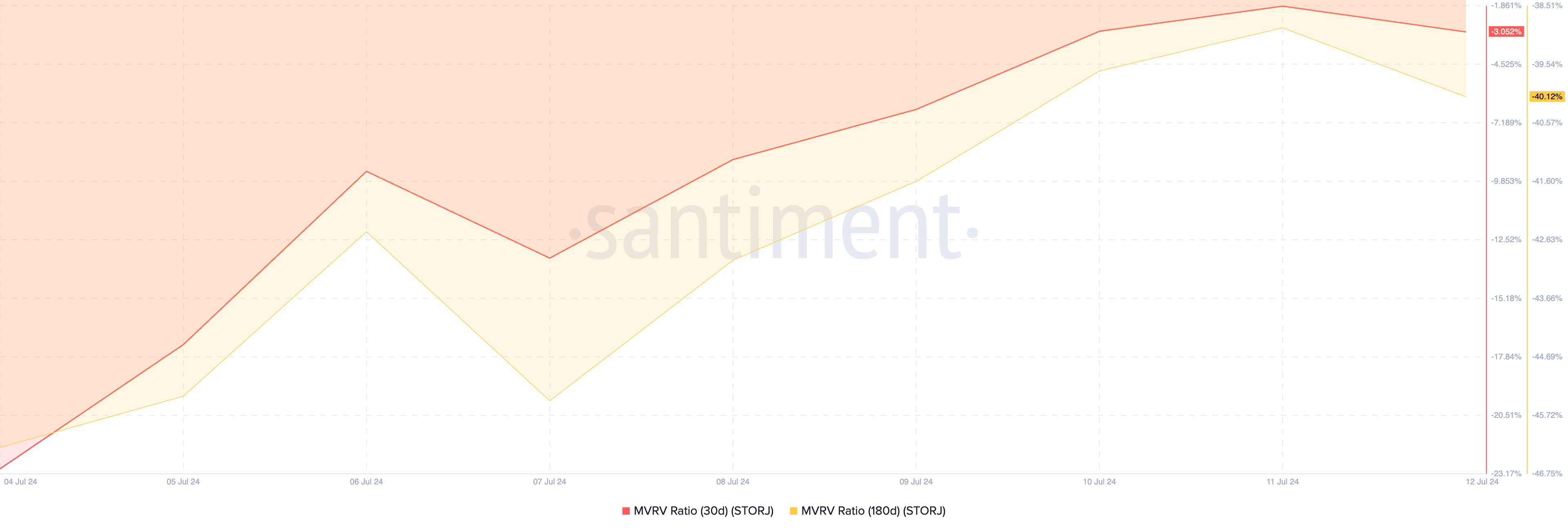 Volgens Santiment zijn de MVRV-ratio’s van STORJ voor de 30-daagse en 365-daagse moving average op dit moment respectievelijk -3,05% en -40,12%.
