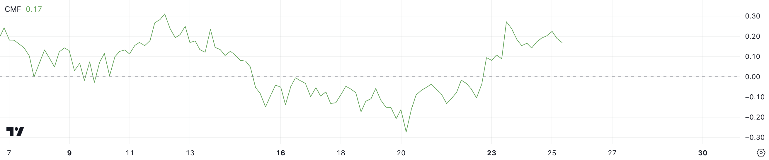 Hoewel de CMF is gedaald vanaf zijn recente piek, suggereert de positieve waarde dat kopers nog steeds de controle hebben, zij het met iets verminderde intensiteit.