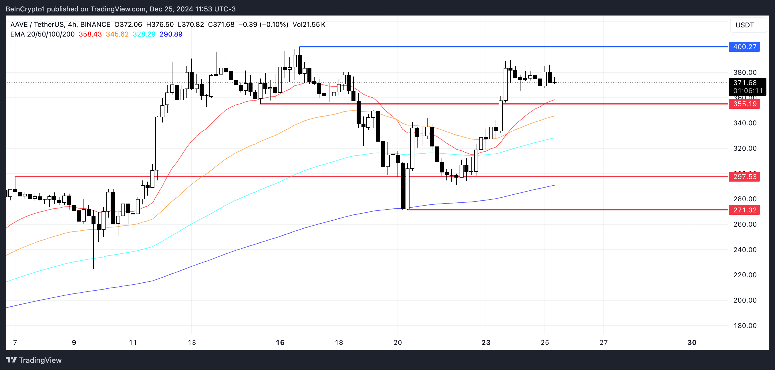 Als het huidige positieve momentum aanhoudt, zou de AAVE koers $400 kunnen testen, een significant niveau dat de hoogste koers sinds 2021 zou markeren. De token hoeft slechts 7,5% te stijgen om deze mijlpaal te bereiken, ondersteund door de golden cross-formatie op 23 december en EMA-lijnen die aangeven dat de opwaartse trend kan aanhouden.