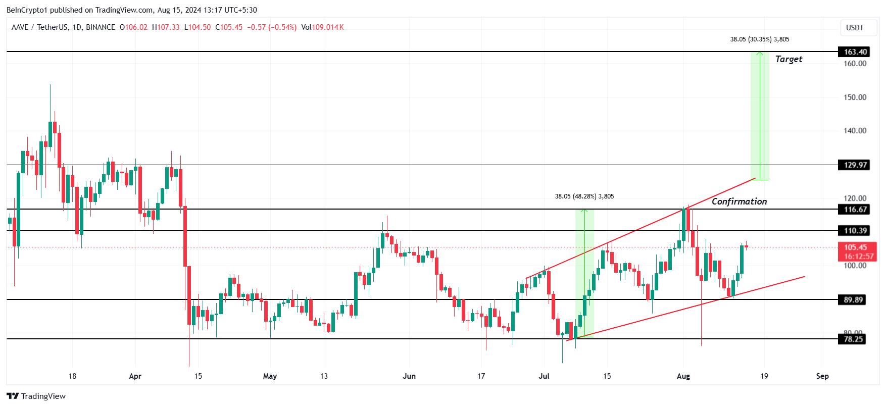 AAVE handelt op $105 en beweegt binnen een verbredend oplopend kanaal. Dit patroon wordt gekenmerkt door uiteenlopende trendlijnen die een wigvorm vormen, met higher highs en higher lows. Het signaleert typisch een potentiële omkering of voortzetting van de huidige trend.