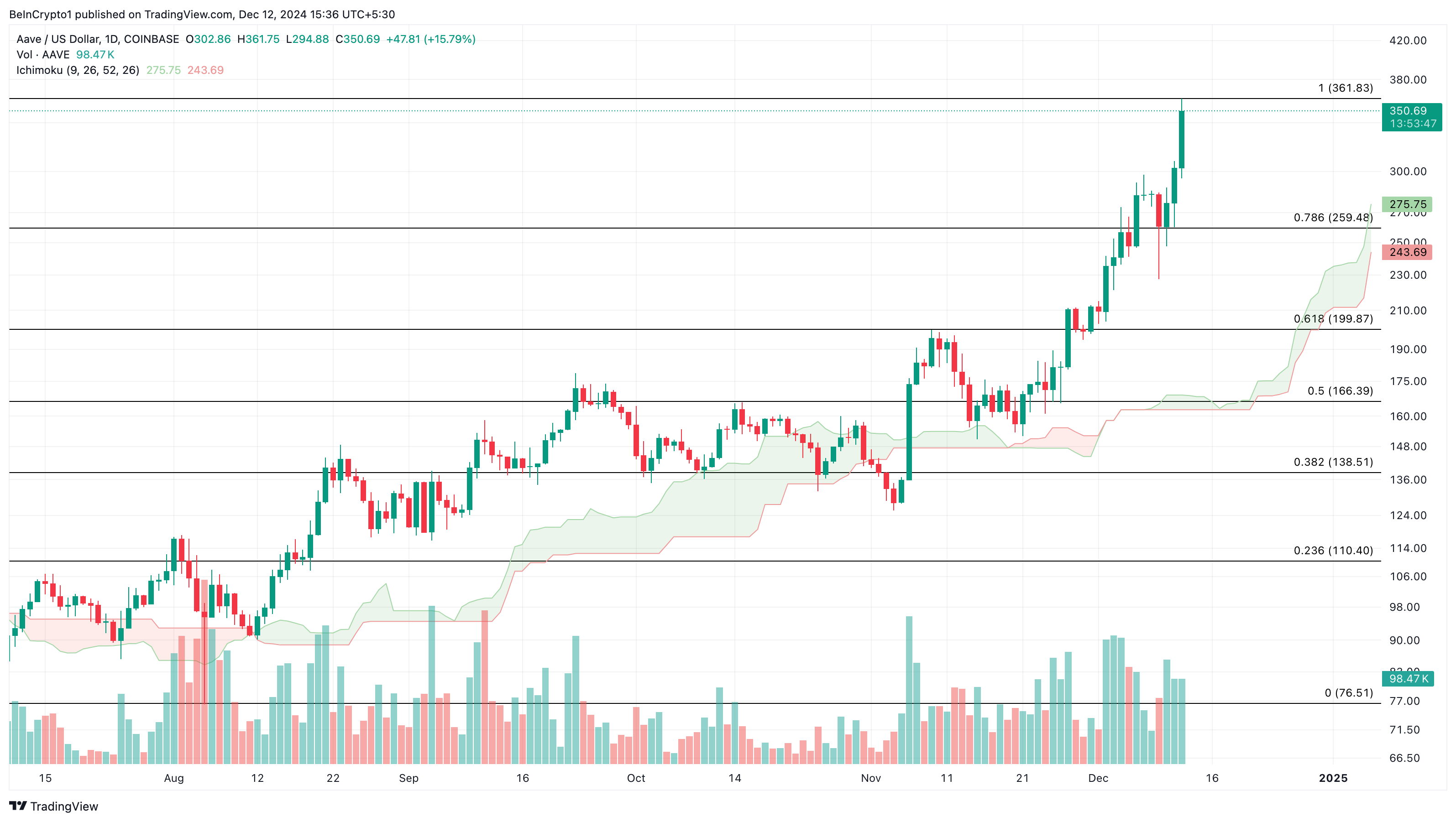 Op de dagelijkse grafiek handelt AAVE’s koers hoger dan de Ichimoku Cloud-positie. De Ichimoku Cloud is een veelzijdige technische indicator die handelaren een duidelijke visualisatie van steun- en weerstandsniveaus biedt.