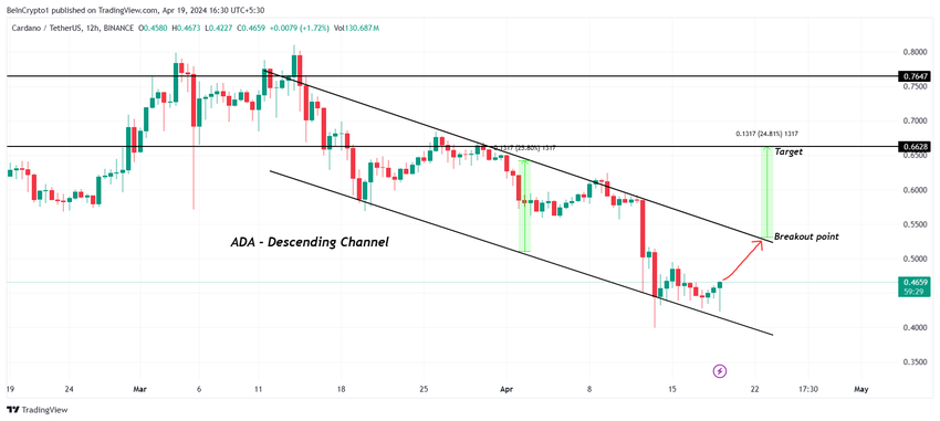 De koers van Cardano wordt op het moment van schrijven verhandeld op $0,46. De altcoin beweegt al meer dan een maand in een dalende wig. Dit bullish chartpatroon, ook wel bekend als een dalende wig, wordt gekenmerkt door convergerende trendlijnen die naar beneden hellen, wat een signaal is voor een potentiële ommekeer in de downtrend.