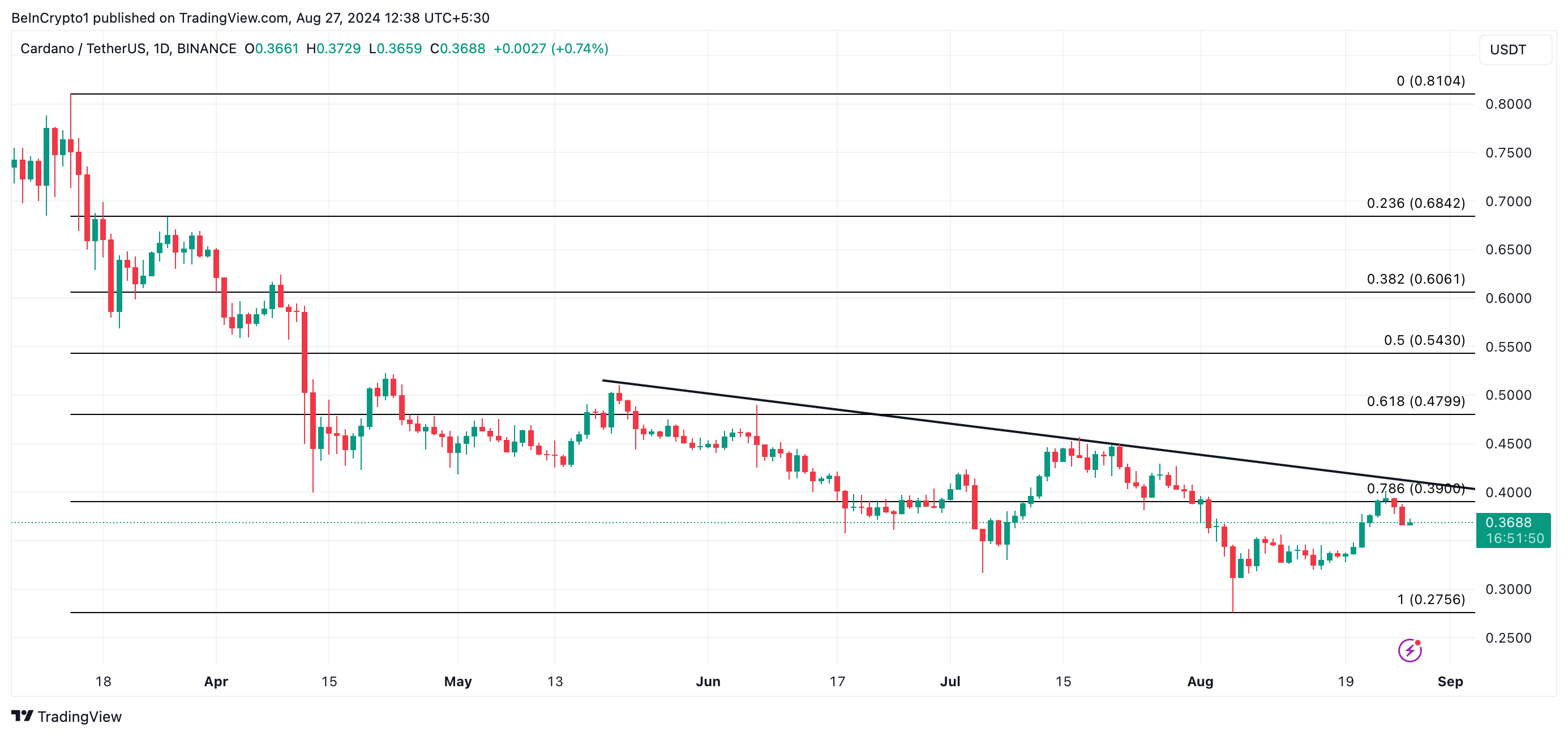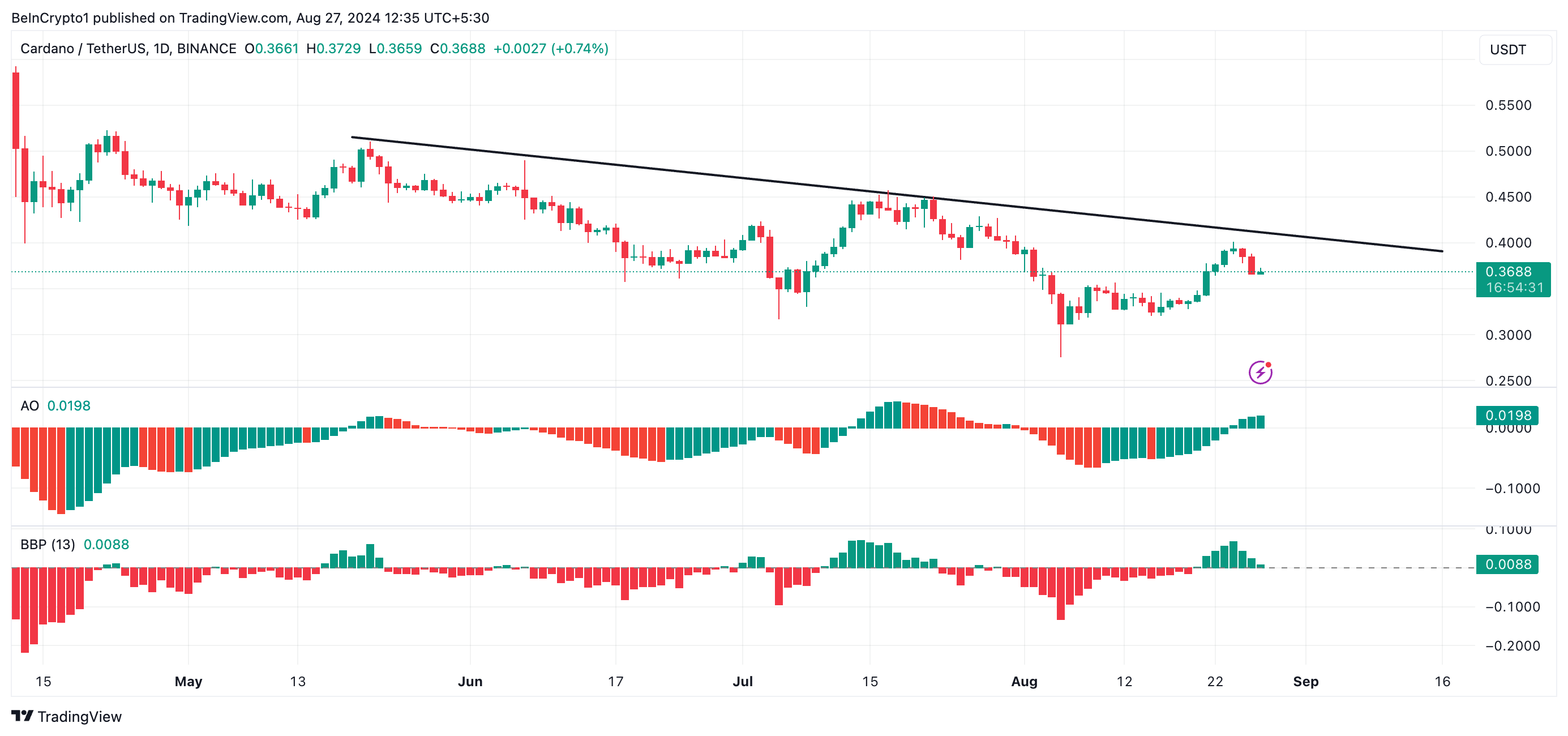 Cardano (ADA) wordt sinds 20 mei verhandeld onder een dalende trendlijn. Momenteel staat de koers op $0,37, wat een daling van 24% betekent sinds het begin van deze periode.