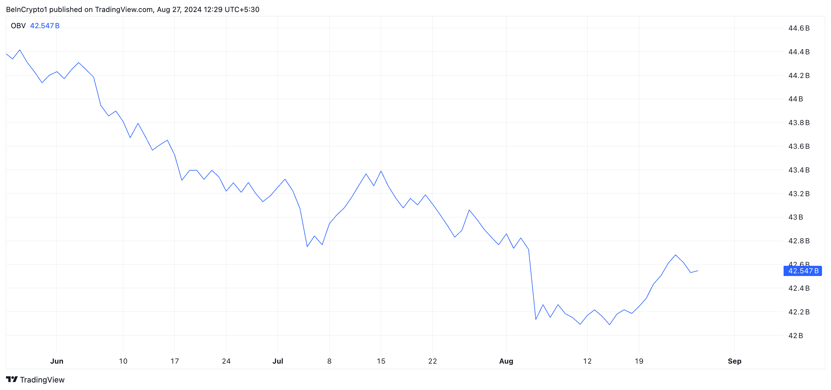 De koers van ADA is in de afgelopen zeven dagen met 8% gestegen, in lijn met de bredere marktgroei, wat blijkt uit een toename van 5% in de wereldwijde cryptomarkt kapitalisatie gedurende dezelfde periode. De stijgende On-Balance-Volume (OBV) suggereert dat sterke marktvraag de koersgroei van ADA heeft aangewakkerd.