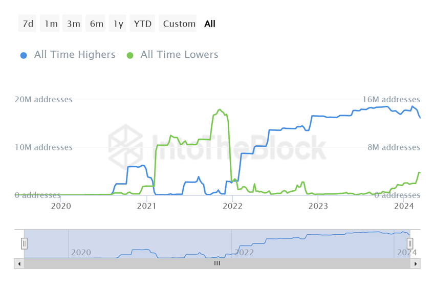 Bijna 16,1 miljoen ALGO holders van de 20 miljoen staan onder water en dat zal waarschijnlijk zo blijven. In feite heeft de koers van Algorand, ondanks de high van 16 maanden, geen deuk in deze statistieken geslagen.