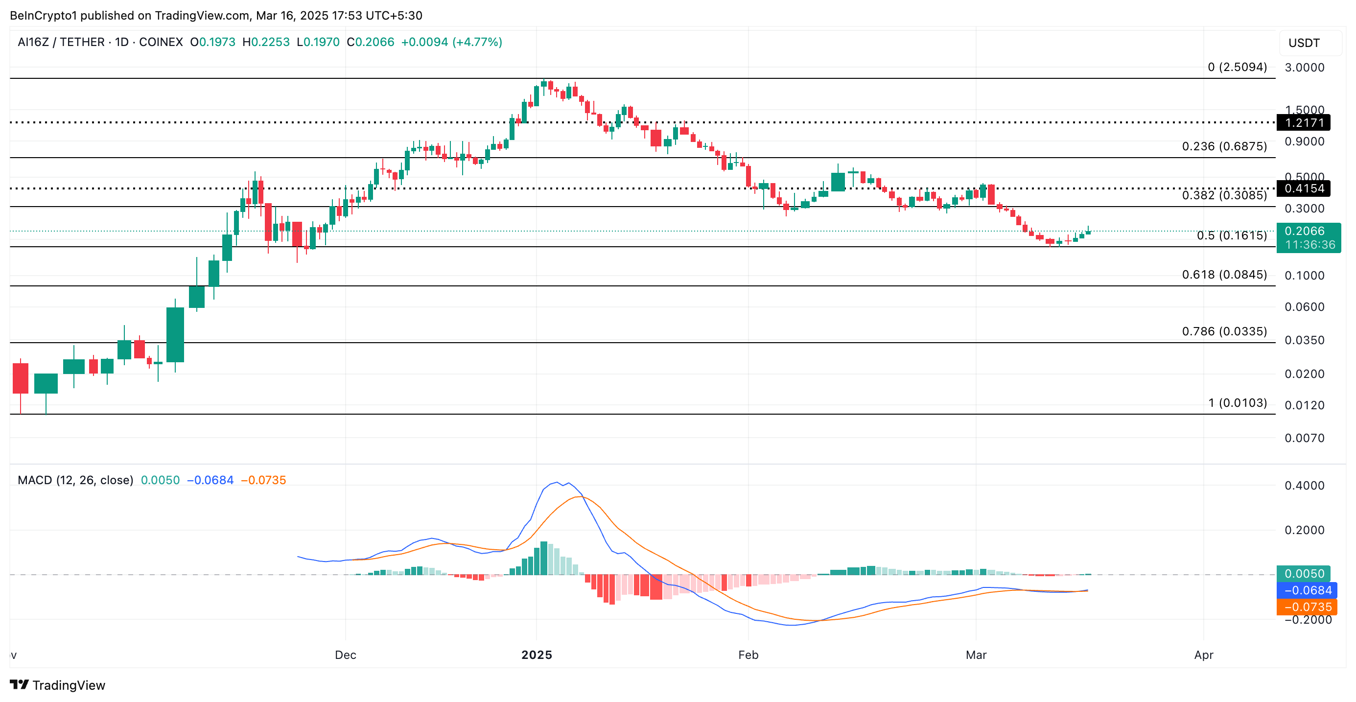 AI16Z wordt momenteel verhandeld voor $0,20. Sinds het dalen naar een year-to-date low van $0,16 op 11 maart, heeft de altcoin een opwaartse trend behouden en is met 25% gestegen.