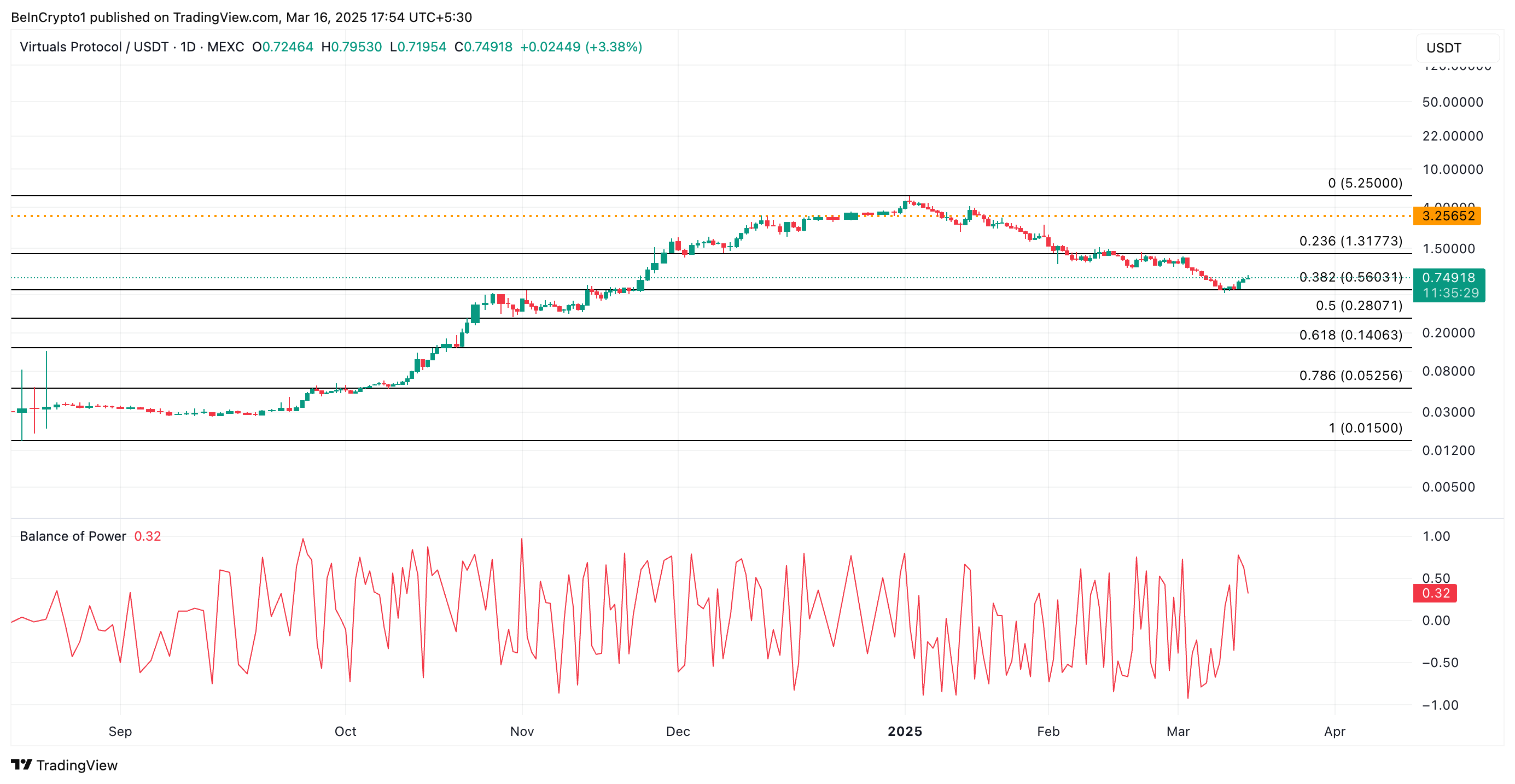 Op de dagelijkse grafiek bevestigt de positieve Balance of Power (BoP) van VIRTUAL de toename in vraag. Op het moment van schrijven staat deze indicator, die de kracht van kopers en verkopers meet, op 0,32.
