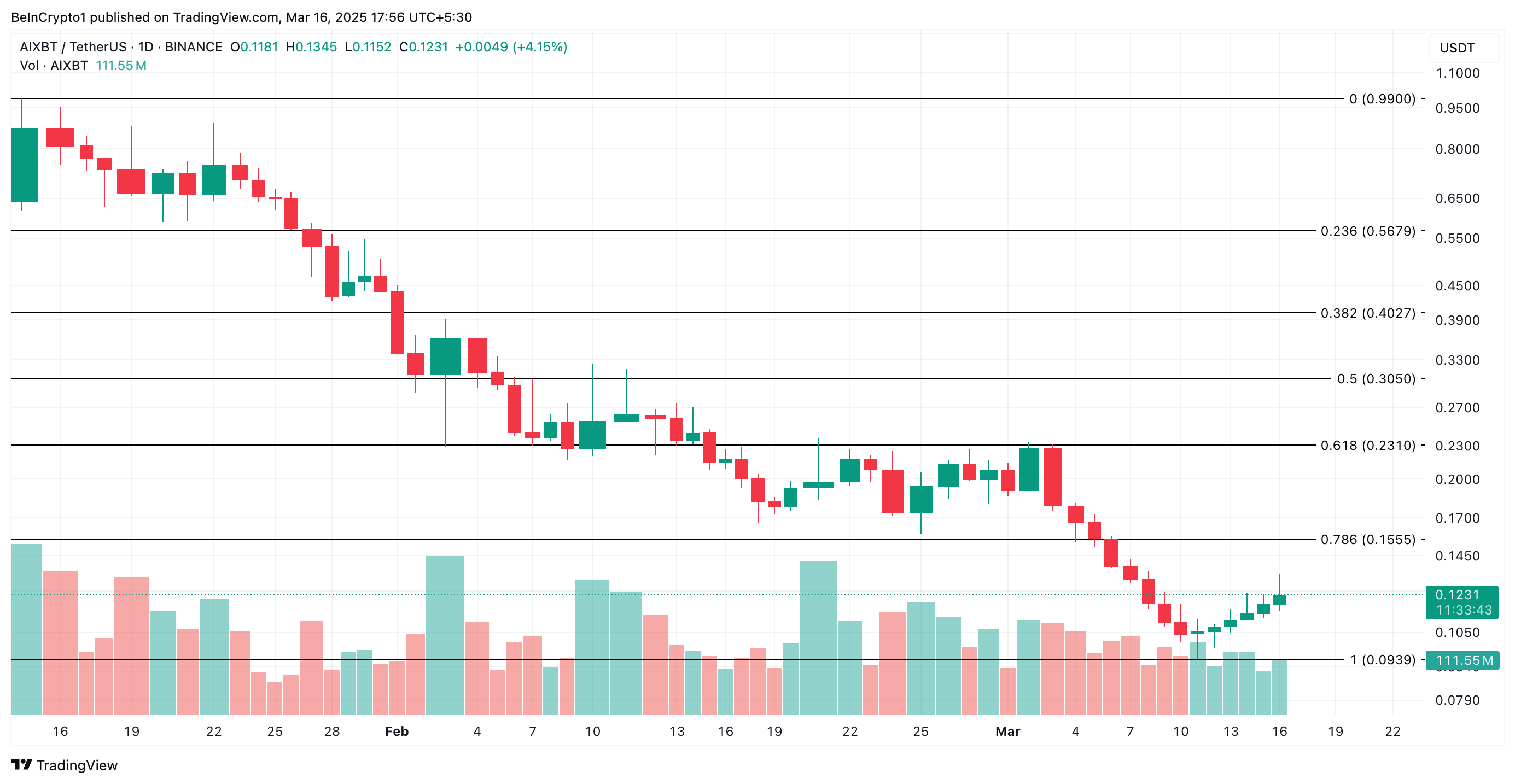 AIXBT is een andere AI-agent token om in maart in de gaten te houden. Met het herstel van de markt is de altcoin met 6% gestegen in de afgelopen 24 uur. Op het moment van schrijven wordt het verhandeld voor $0,12.