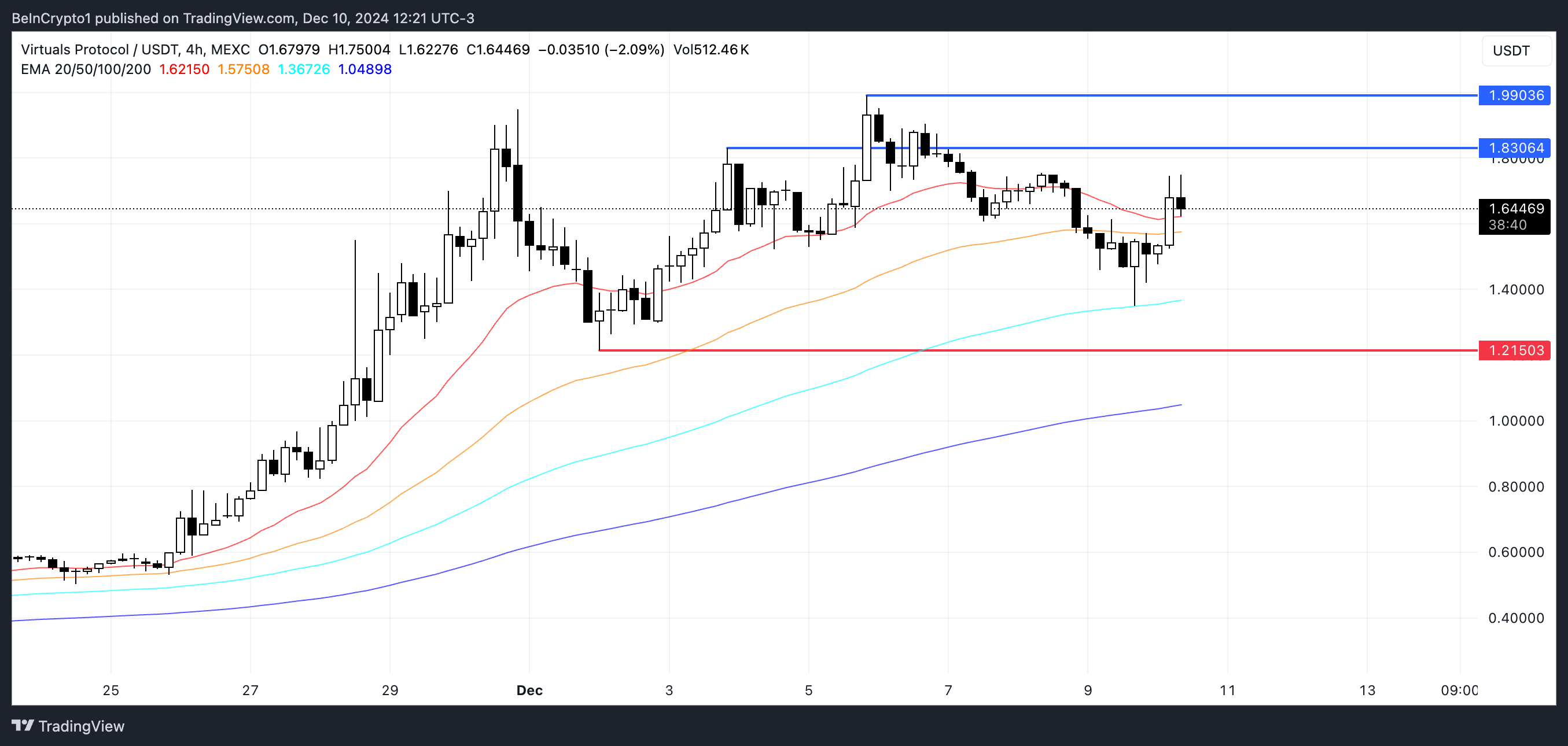 Als de opwaartse trend weer aan kracht wint, kan VIRTUAL de weerstand op $1,83 testen. Als dat niveau wordt doorbroken, kan het stijgen om zijn vorige all-time high van $1,99 te testen, bereikt op 5 december, terwijl AI-crypto-agenten blijven aantrekken. Een andere belangrijke indicator is dat VIRTUAL vandaag stijgt, terwijl de andere 4 grootste AI coins, zoals RENDER en TAO, respectievelijk met 12% en 18% dalen.