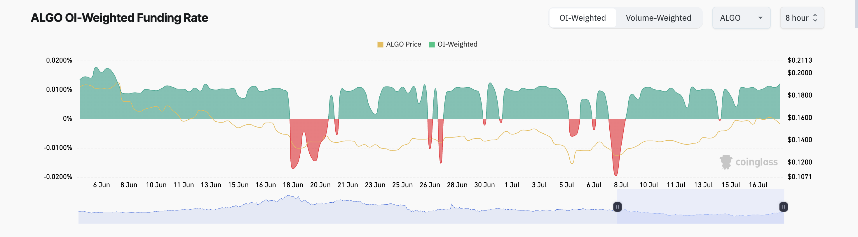 Een ander bullish signaal dat de mogelijkheid van verdere koersgroei bevestigt, is ALGO’s positieve funding rate op cryptocurrency exchanges. Sinds 10 juli is de funding rate van de token boven 0 gebleven. Volgens data van Coinglass is het momenteel 0,01%.