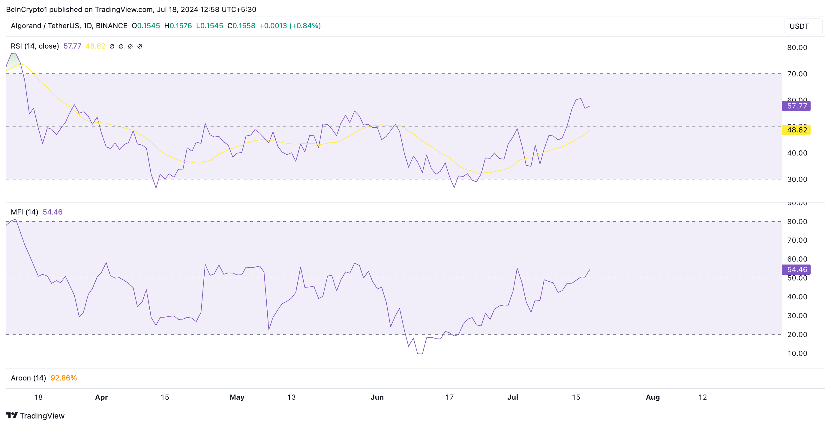 De Relative Strength Index (RSI) van de altcoin bevindt zich bijvoorbeeld in een uptrend op 58,52 op het moment van schrijven. Ook de Money Flow Index (MFI) staat boven de 50-neutrale lijn op 54.50.