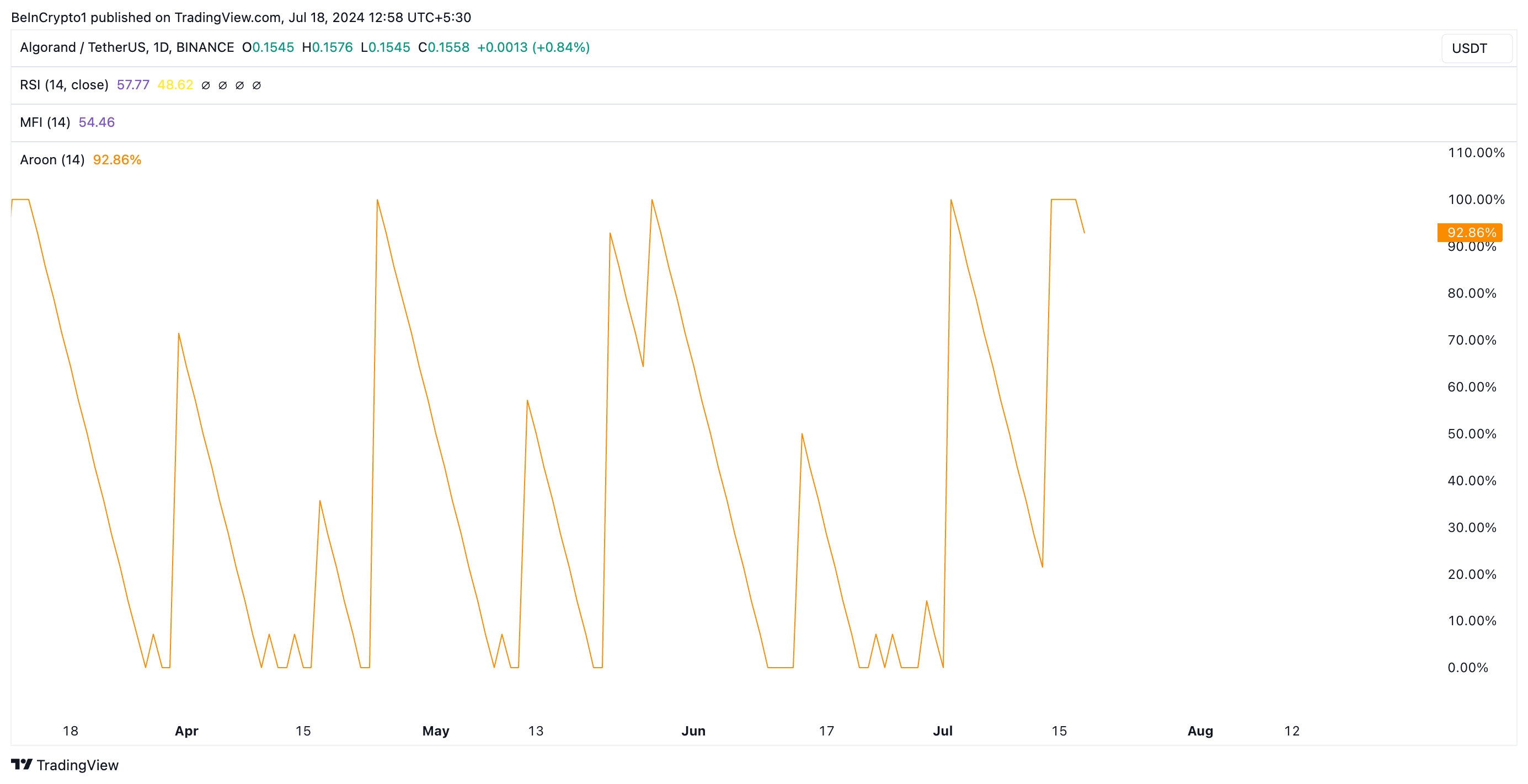 Verder is ALGO’s Aroon Up Line op het moment van schrijven 92,86%. Dit bevestigt de kracht van de huidige uptrend en wijst op de mogelijkheid van een verdere koersrally.