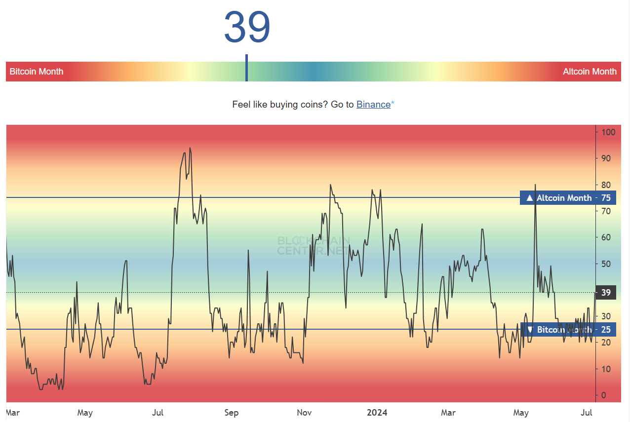 Volgens de Altcoin Season Index is de markt momenteel getuige van Bitcoin Season. Over het algemeen wordt een Altcoin Season als actief beschouwd wanneer 75% van de top 50 altcoins, exclusief stablecoins, beter presteren dan BTC.