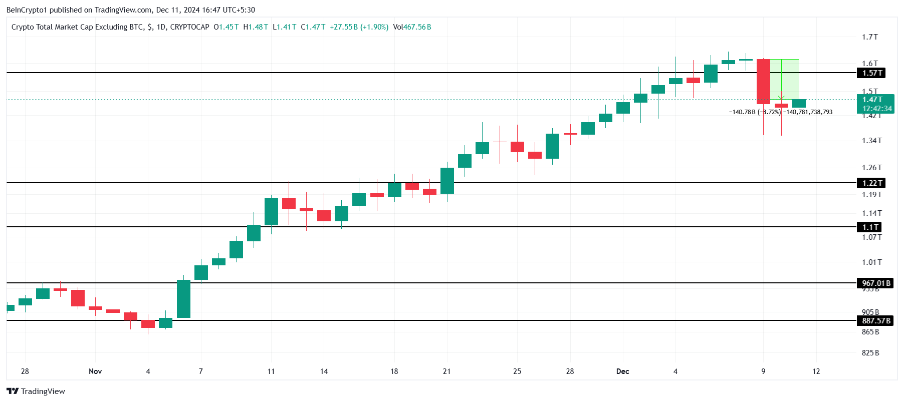 Momenteel probeert de crypto marktkapitalisatie het niveau van $1,57 biljoen als steun te herwinnen. Dit prijsniveau is cruciaal voor het behouden van een bullish vooruitzicht op de korte termijn. Als de marktkapitalisatie dit niveau kan vasthouden, kan dit de basis leggen voor een potentiële opwaartse trend, waardoor het vertrouwen van investeerders stabiliseert.