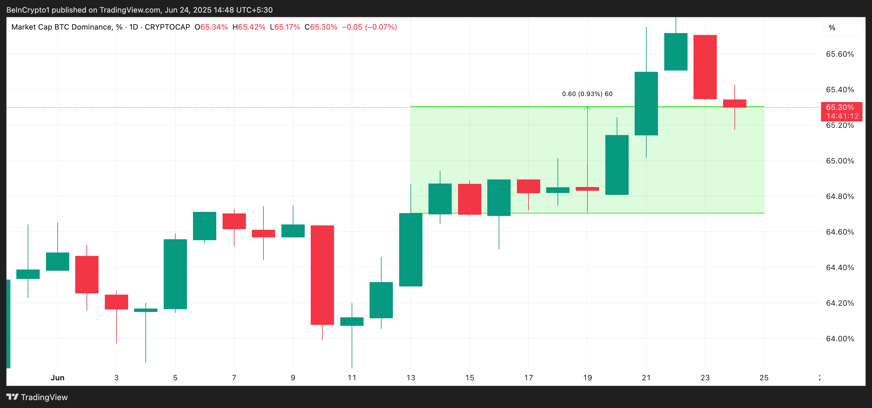 Sinds 13 juni, nadat Israël een grote operatie tegen Iran uitvoerde, is de Bitcoin-dominantie gestegen. Het staat momenteel op 65,30%, een stijging van bijna 1% sinds de eerste aanval van Israël.