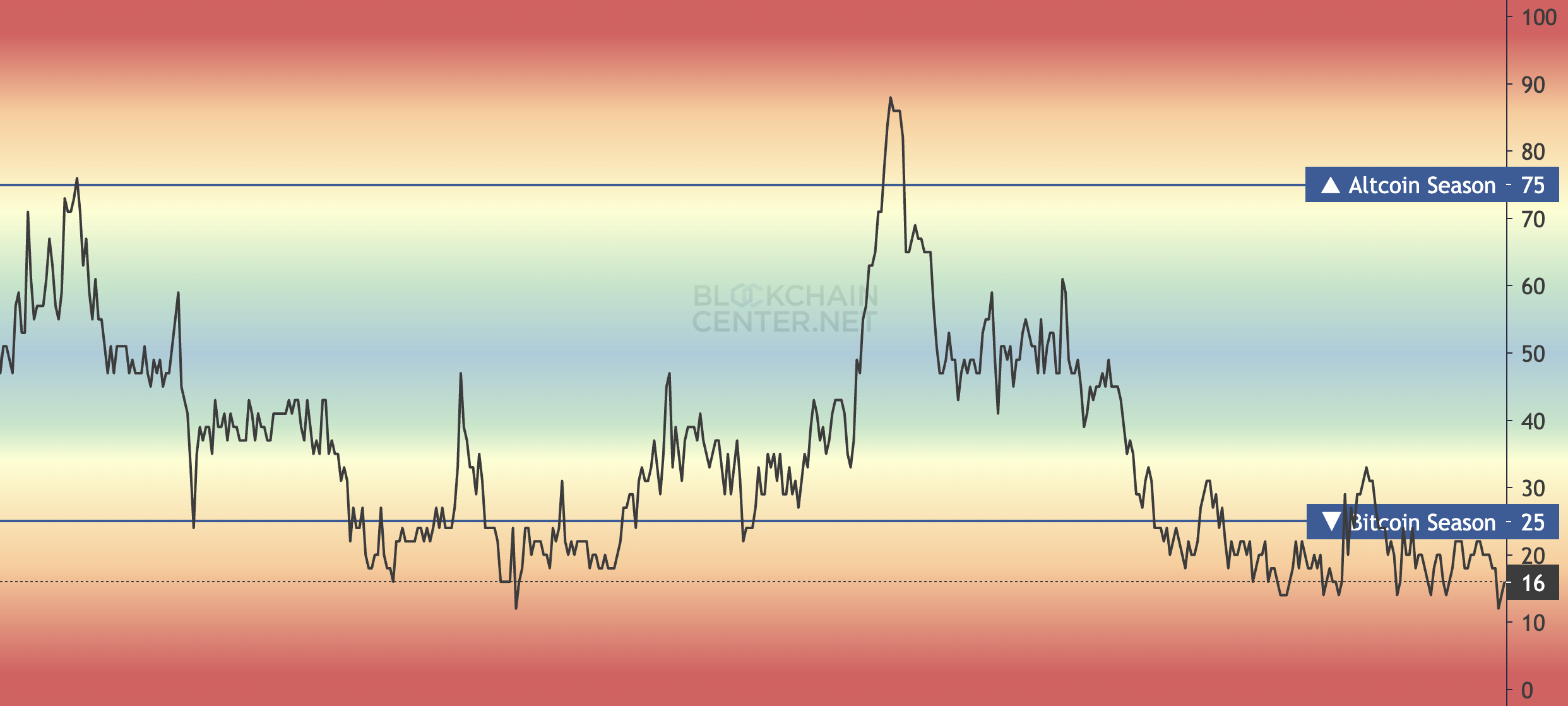 Volgens Blockchain Center heeft slechts 16% dit kunnen doen in de afgelopen 90 dagen, wat een achterstand in de prestaties van altcoins laat zien en suggereert dat een echt altseason nog ver weg is.
