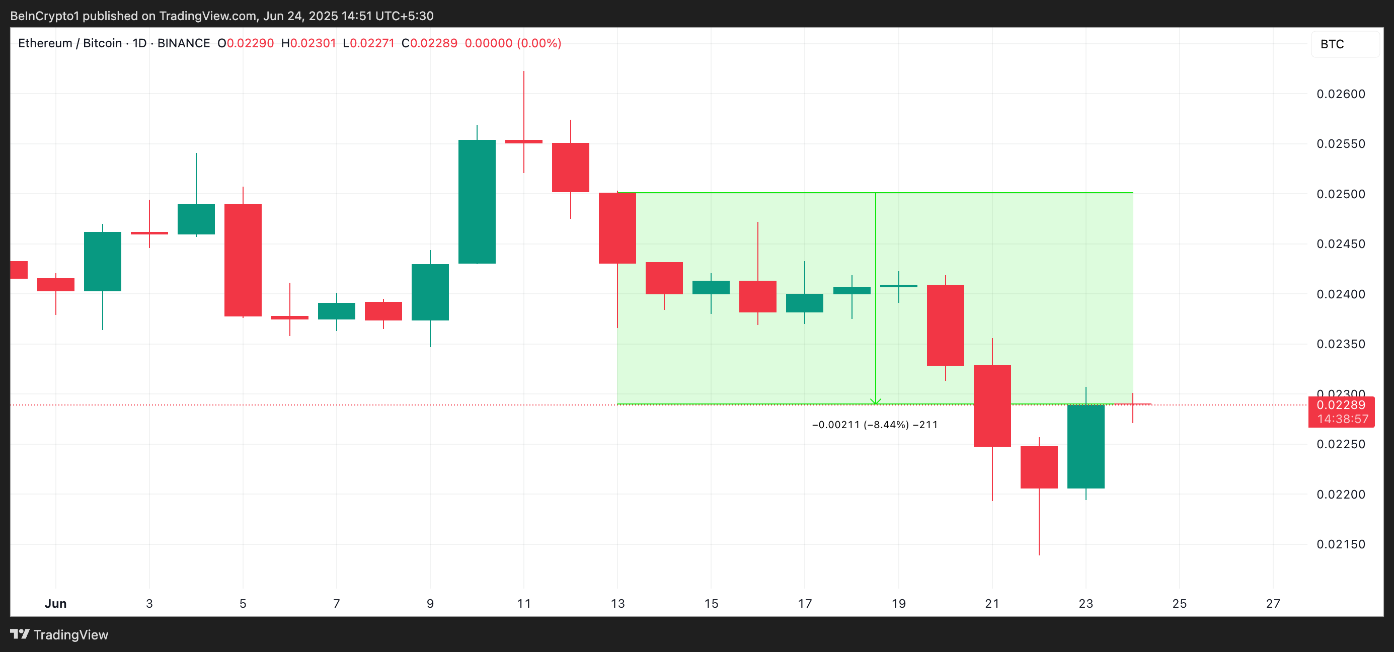 Gedurende dezelfde periode is de ETH/BTC-ratio gedaald.