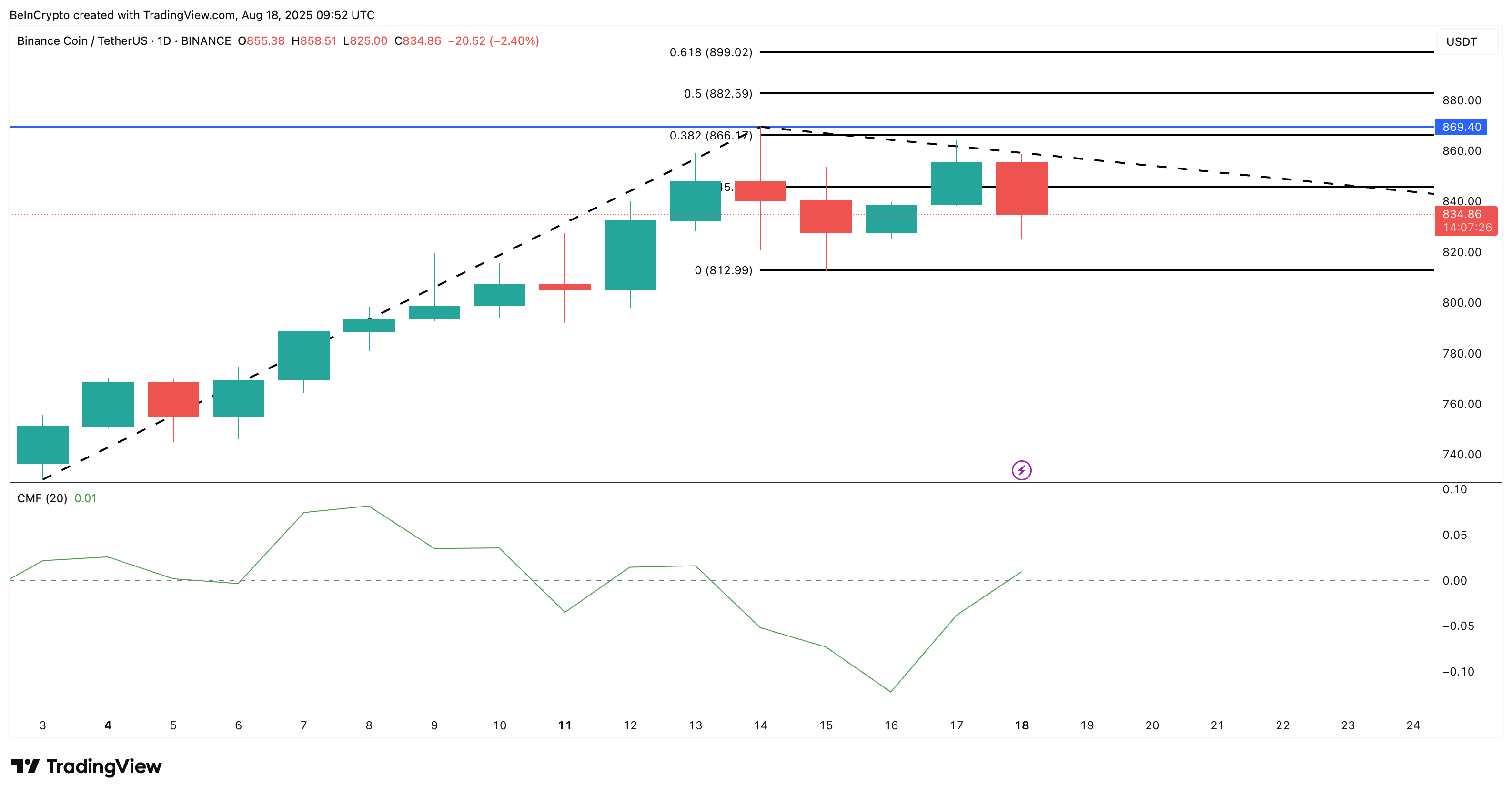 Binance Coin (BNB) handelt momenteel rond $834, na een dagelijkse daling van 3,4%. De grafiek toont een relatief stabiele steun net boven $812. Elke daling onder dit niveau zou de all-time high voorlopig kunnen uitstellen.
