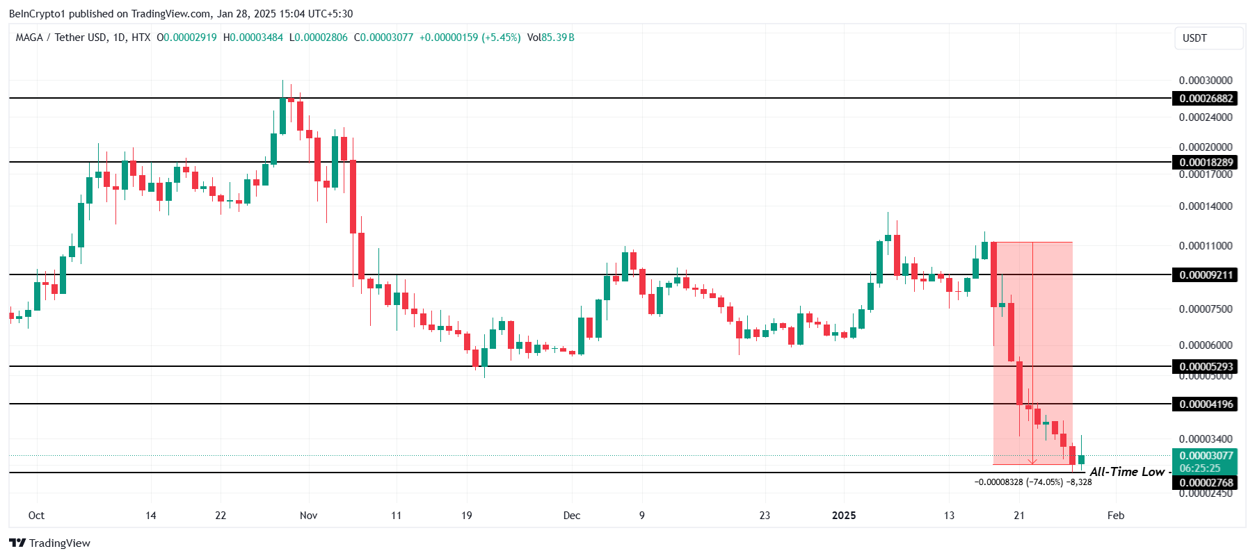 Momenteel verhandeld op $0,00003077, heeft MAGA een nieuwe all-time low van $0,00002768 gevormd na het verliezen van kritieke steunniveaus op $0,00005293 en $0,00004196. Het niet vasthouden van deze belangrijke niveaus heeft het bearish momentum versterkt, waardoor het vertrouwen van investeerders op korte termijn is ontmoedigd.