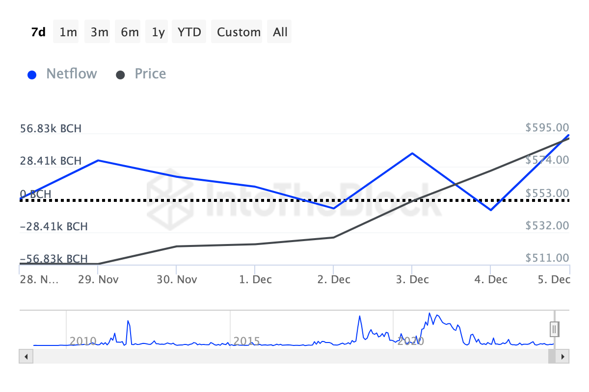 Bitcoin Cash, de hard fork van Bitcoin uit 2017, is ook een van de top altcoins die crypto whales deze week hebben gekocht. Volgens gegevens van IntoTheBlock daalde de netflow van grote houders aanzienlijk op 4 december.