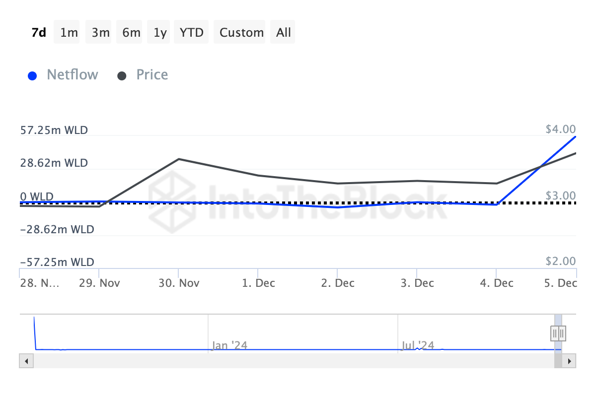 Echter, vandaag is dat cijfer gestegen naar 57,25 miljoen, wat aangeeft dat crypto whales Worldcoin in grote hoeveelheden hebben verzameld. Bij de huidige koers is deze accumulatie ongeveer $220 miljoen waard. Het lijkt erop dat deze opmerkelijke aankopen invloed hebben gehad op de koers van Worldcoin, die met 35% is gestegen naar $3,86.