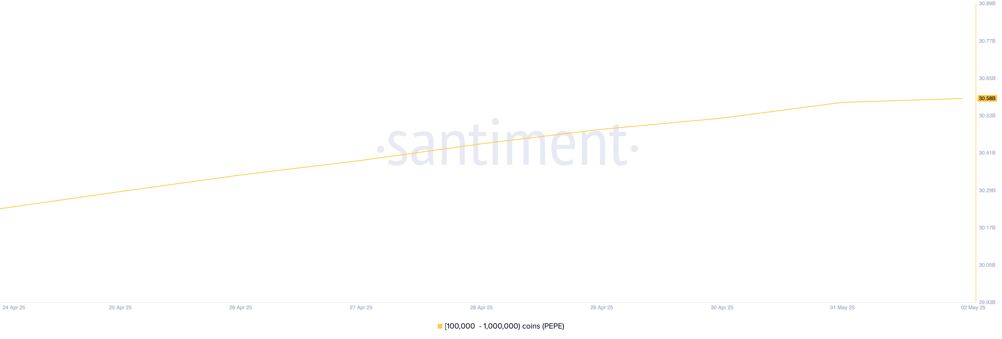 Populaire meme coin PEPE is een ander asset dat deze week een toename in crypto whale-accumulatie heeft gezien. Volgens Santiment hebben wallet-adressen die tussen de 100.000 en 1 miljoen tokens bezitten, de afgelopen zeven dagen 350 miljoen PEPE gekocht.
