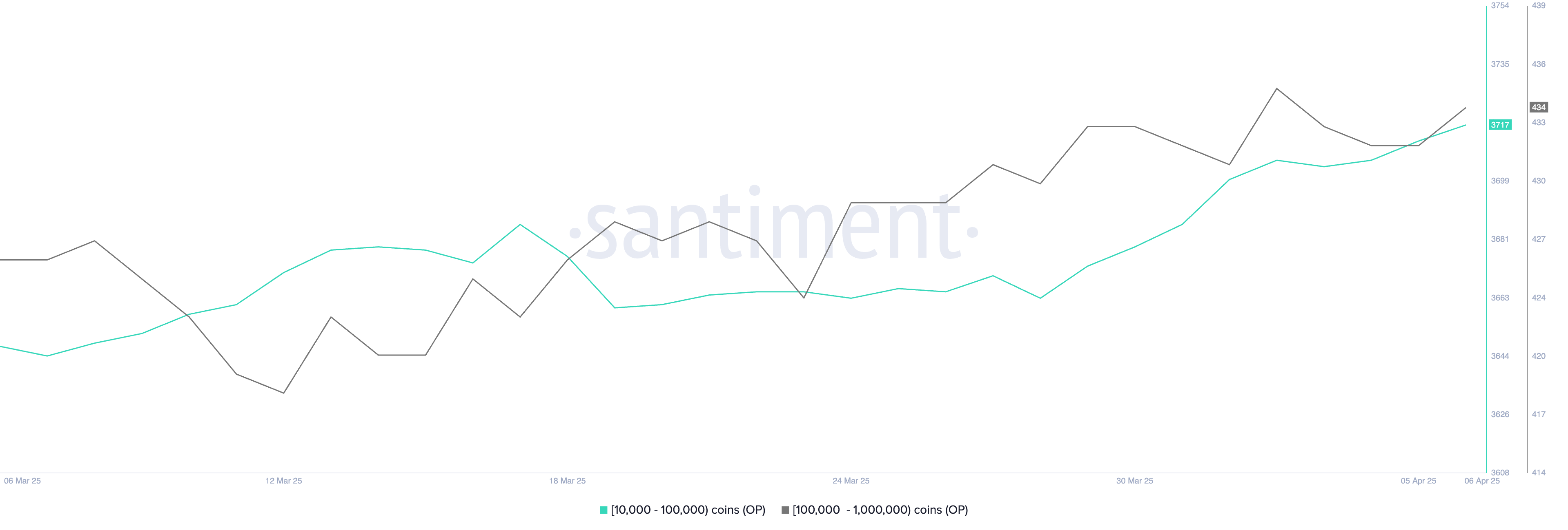 Het aantal Optimism whale wallets—met tussen 10.000 en 1.000.000 OP—steeg van 4.138 op 4 april naar 4.151 op 6 april, wat suggereert dat grote houders accumuleren ondanks de aanhoudende marktcorrectie.