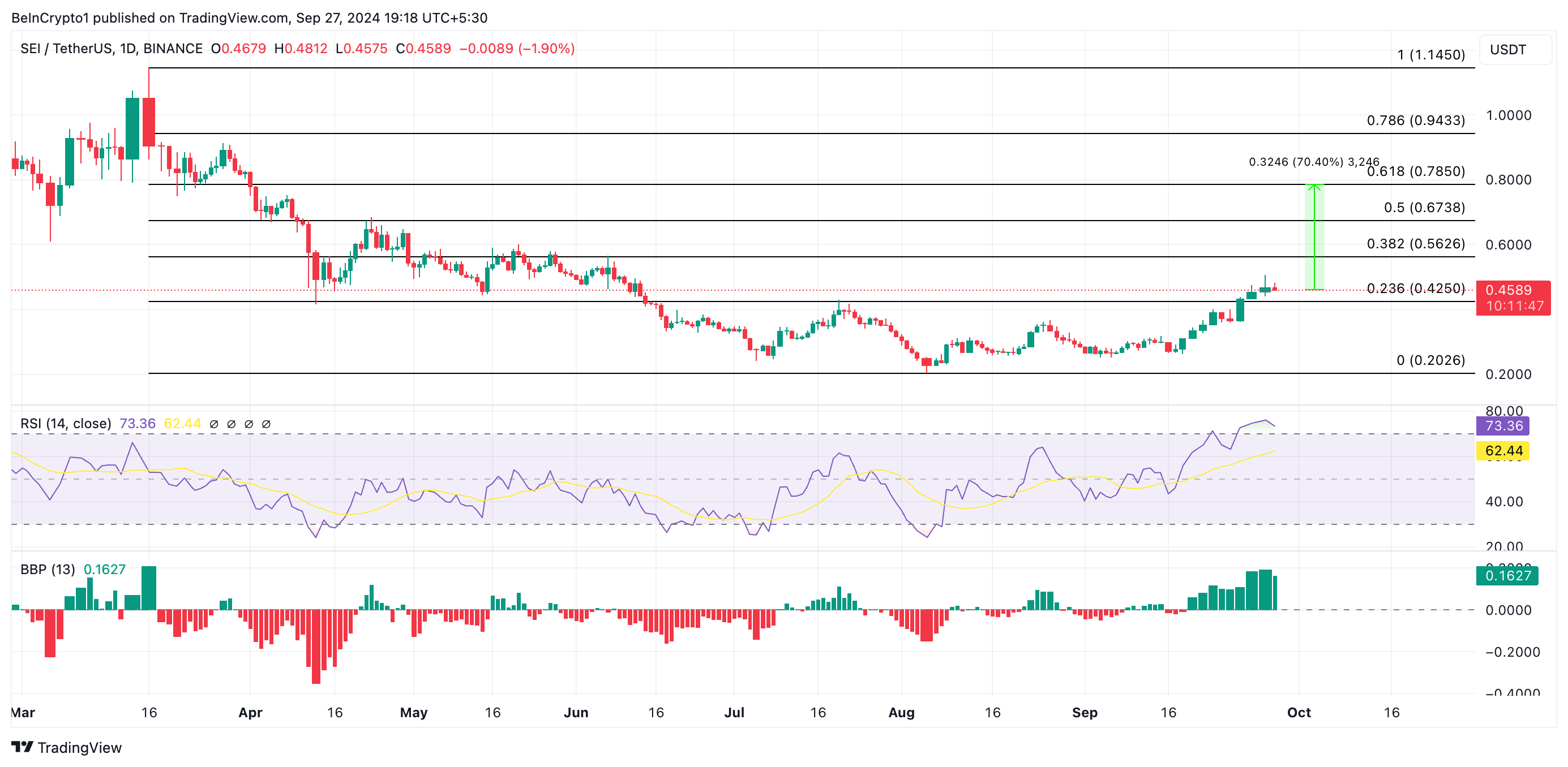 Echter, voor handelaren die willen profiteren van de rally, is het belangrijk om op te merken dat SEI in oktober mogelijk een prijsomkering kan ondergaan. De Relative Strength Index (RSI), die momenteel op 73,36 staat, suggereert dat de altcoin overbought is.