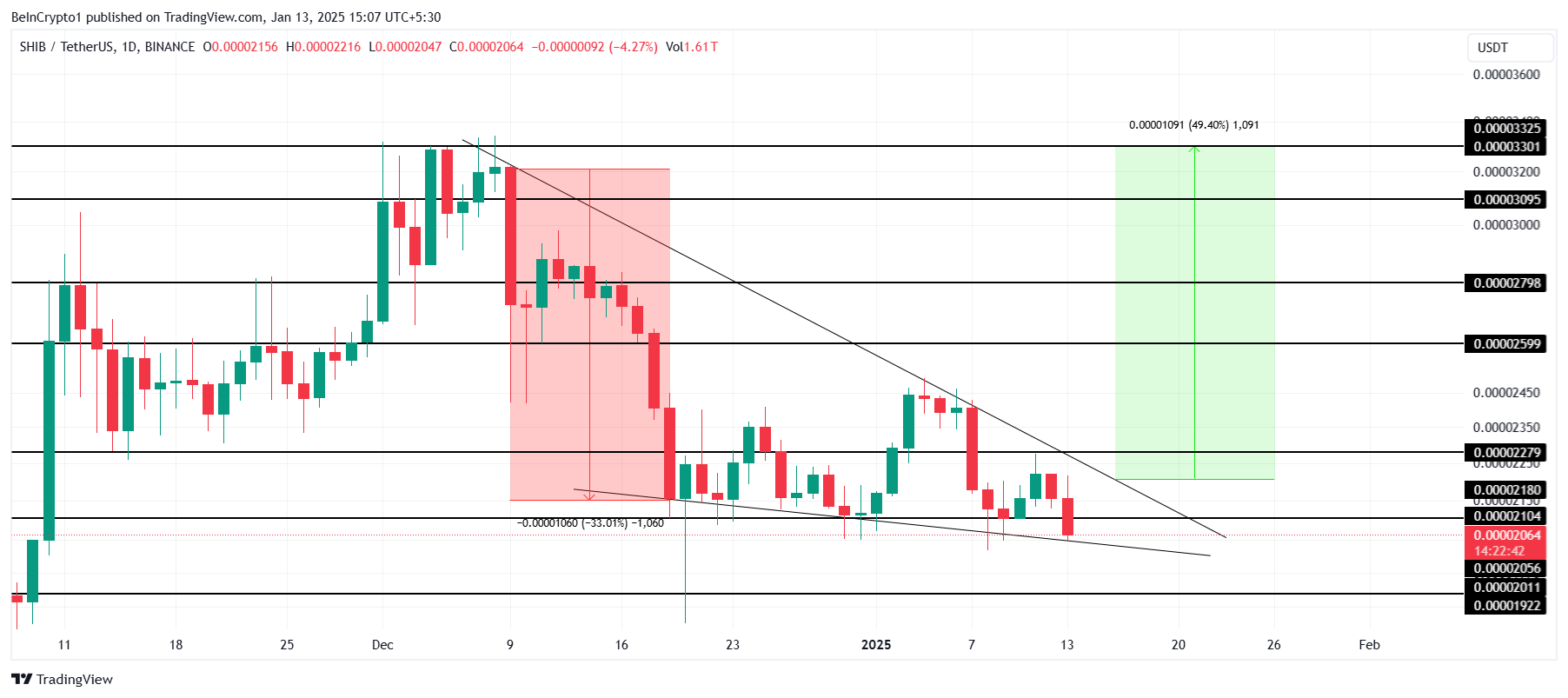 Als er een uitbraak plaatsvindt, zou de altcoin $0,00002279 als zijn volgende weerstandsniveau kunnen bereiken. Het dalende wigpatroon suggereert een potentiële stijging van 49%, wat SHIB naar $0,00003325 zou kunnen stuwen, waardoor optimisme onder investeerders wordt hersteld en een sterk herstel wordt gesignaleerd.