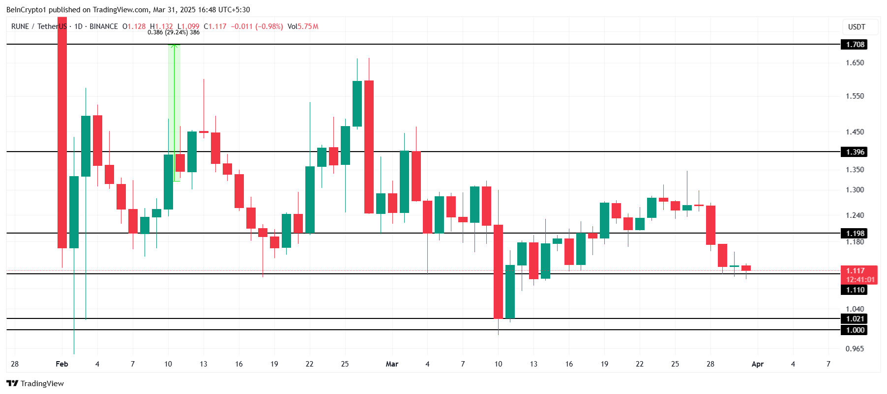 Als de steun op $1,110 wordt doorbroken, kan RUNE dalen naar $1,021, waardoor het dichter bij het verliezen van het kritieke niveau van $1,000 komt. Het niet behouden van steun kan een bearish trend signaleren, waardoor de bullish verwachting ongeldig wordt.