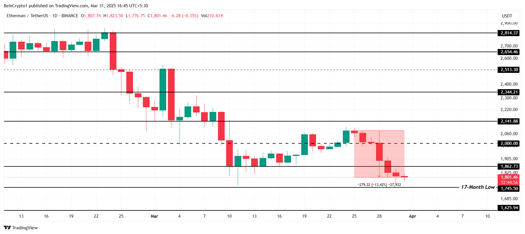 Ethereum koers nadert een 17-maandse low van $1.745, na een daling van 13,42% na het niet doorbreken van de weerstand van $2.141. Deze recente koersactie suggereert dat de grootste altcoin moeite heeft om momentum te herwinnen. De marktomstandigheden blijven ongunstig voor een snel herstel op dit moment.