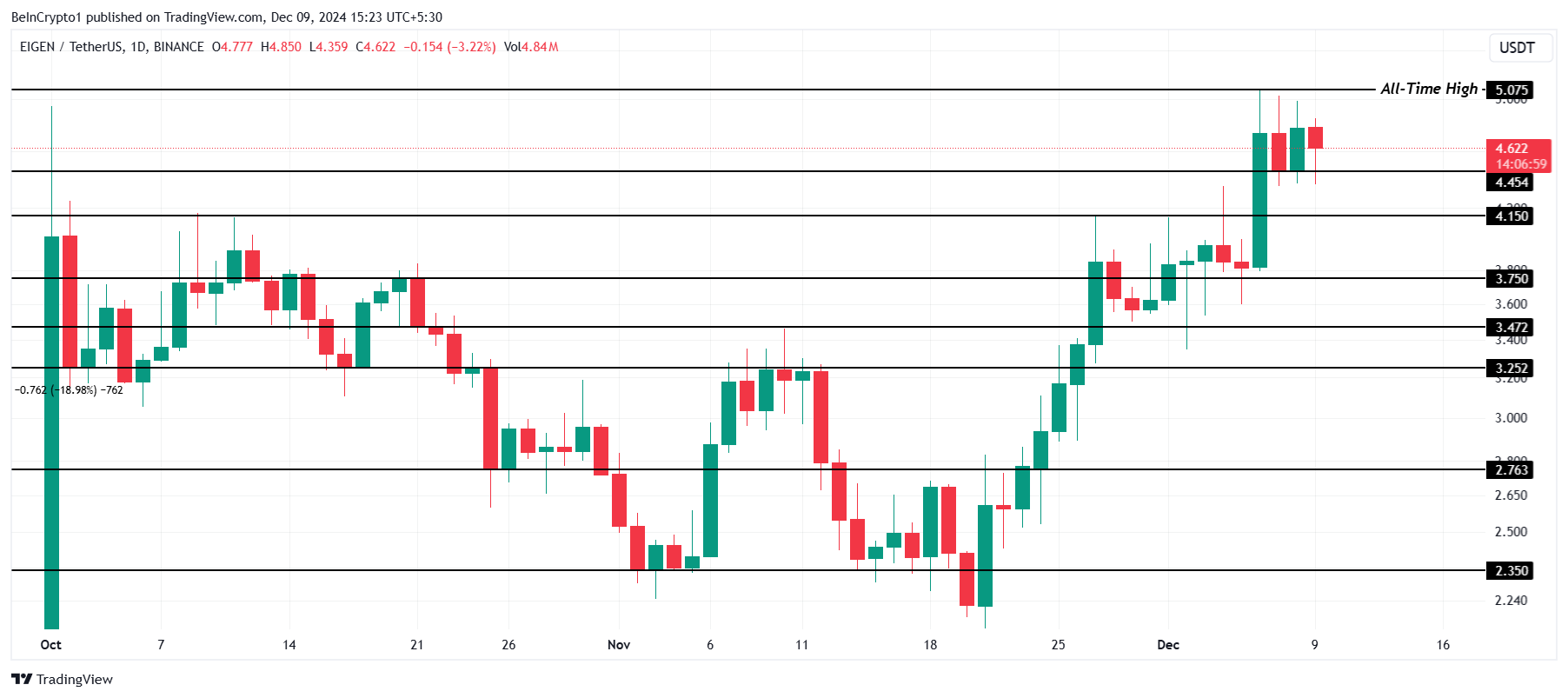 Gezien de verwachtingen rondom de Rewards V2-upgrade, zou de EIGEN koers een aanzienlijke boost kunnen ervaren. Echter, als de altcoin er niet in slaagt zijn ATH van $5,07 te overtreffen, kan het consolideren binnen een bereik tussen $4,45 en de vorige high. Dit scenario zou een tijdelijke pauze suggereren voordat een mogelijke uitbraak of verdere correctie plaatsvindt.