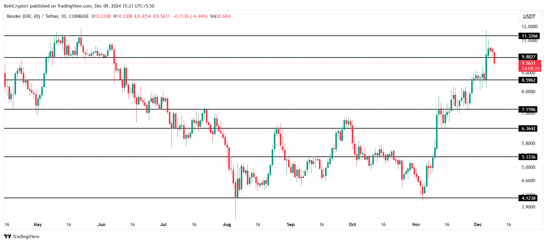 Render koers worstelt momenteel rond het $9,88 steunniveau, wat cruciaal is voor het behouden van recente winsten. Een succesvolle sluiting boven dit niveau zal de altcoin helpen momentum te behouden en het volgende weerstandsniveau van $11,32 te bereiken. Het niet vasthouden van de steun kan leiden tot een mogelijke terugval.