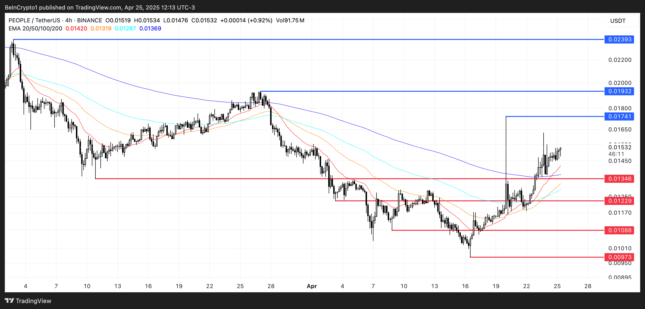 Als deze sterkte aanhoudt, zou PEOPLE op weg kunnen zijn om belangrijke weerstandsniveaus van $0,0174, $0,0193 en mogelijk zelfs $0,0239 te testen.