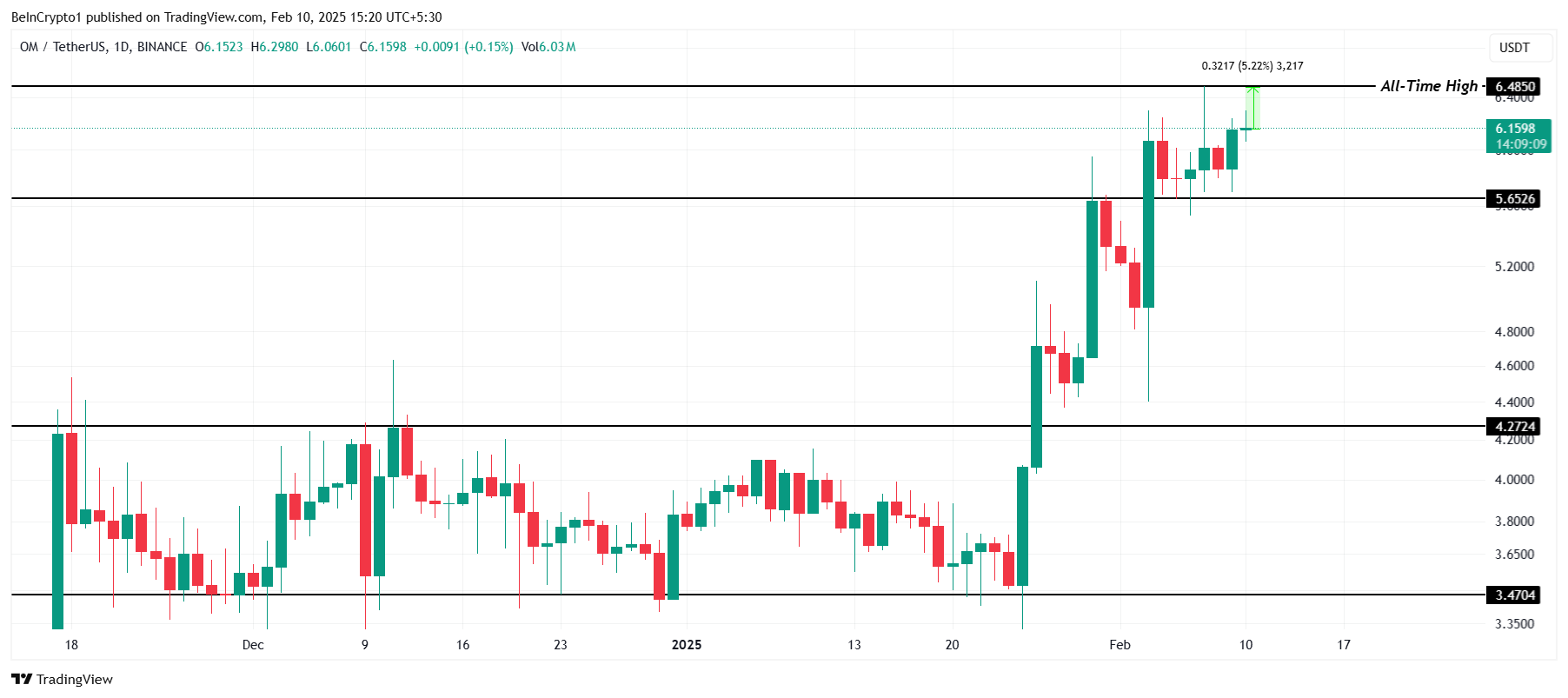 OM is veerkrachtig gebleven te midden van bearish marktomstandigheden en heeft scherpe correcties vermeden. Momenteel verhandeld op $6,15, heeft de altcoin sterke koersstabiliteit getoond. Deze prestatie onderscheidt OM van andere cryptocurrencies die moeite hebben om belangrijke steunniveaus vast te houden.