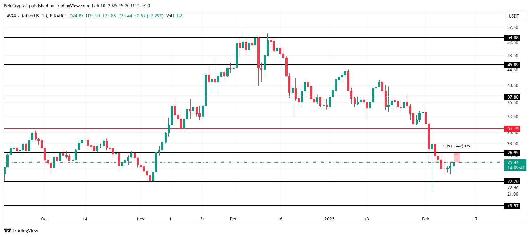 Echter, als het niet lukt om door $26,95 te breken, kan dit een bearish reactie veroorzaken. Als de token unlock niet voldoende koopdruk genereert, kan AVAX dalen naar $22,70. Een verdere daling onder deze steun kan verliezen verlengen, wat de stemming naar voorzichtigheid verschuift en elk potentieel herstel op korte termijn vertraagt.