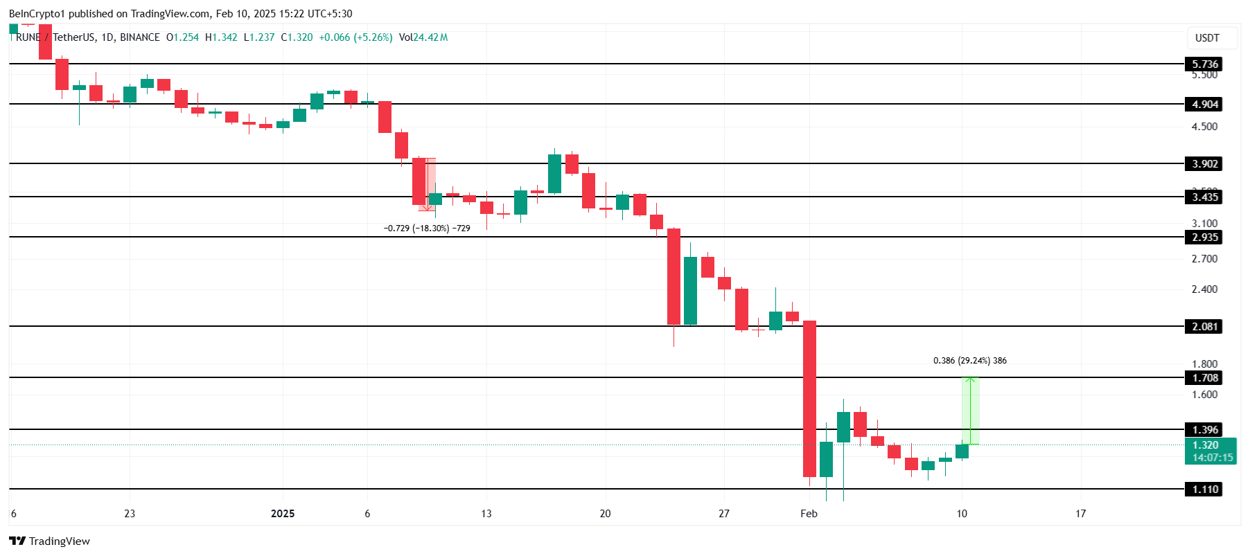 Met sterke steun van de gemeenschap voor de update, kan de koers van RUNE profiteren van het bullish sentiment. Als de koopdruk toeneemt, kan de cryptocurrency door de weerstand van $1,39 breken en stijgen naar $1,70. Deze beweging zou een stijging van 30% betekenen, wat het vertrouwen in THORChain’s langetermijnontwikkeling en governanceverbeteringen versterkt.