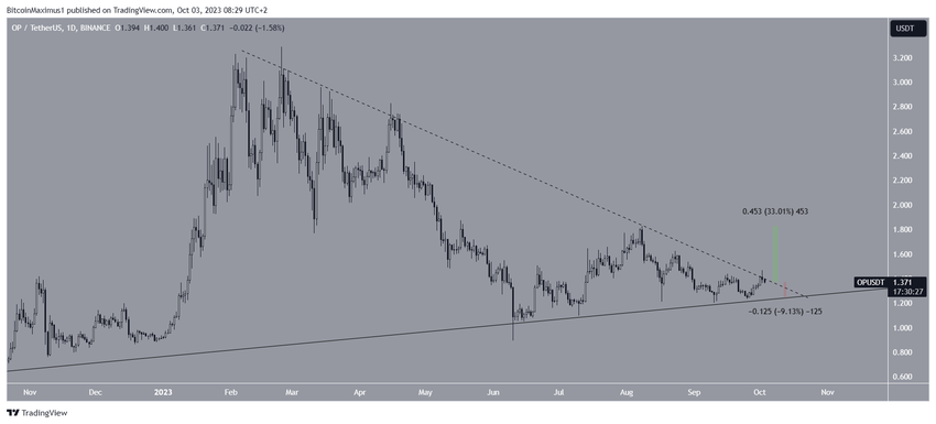 Als dit het geval is voor OP, dan kan de koers met 33% stijgen en de volgende weerstand op $1,80 bereiken. Aan de andere kant kan een plotselinge daling van het momentum de koers omlaag brengen naar de stijgende steunlijn op $1,25.