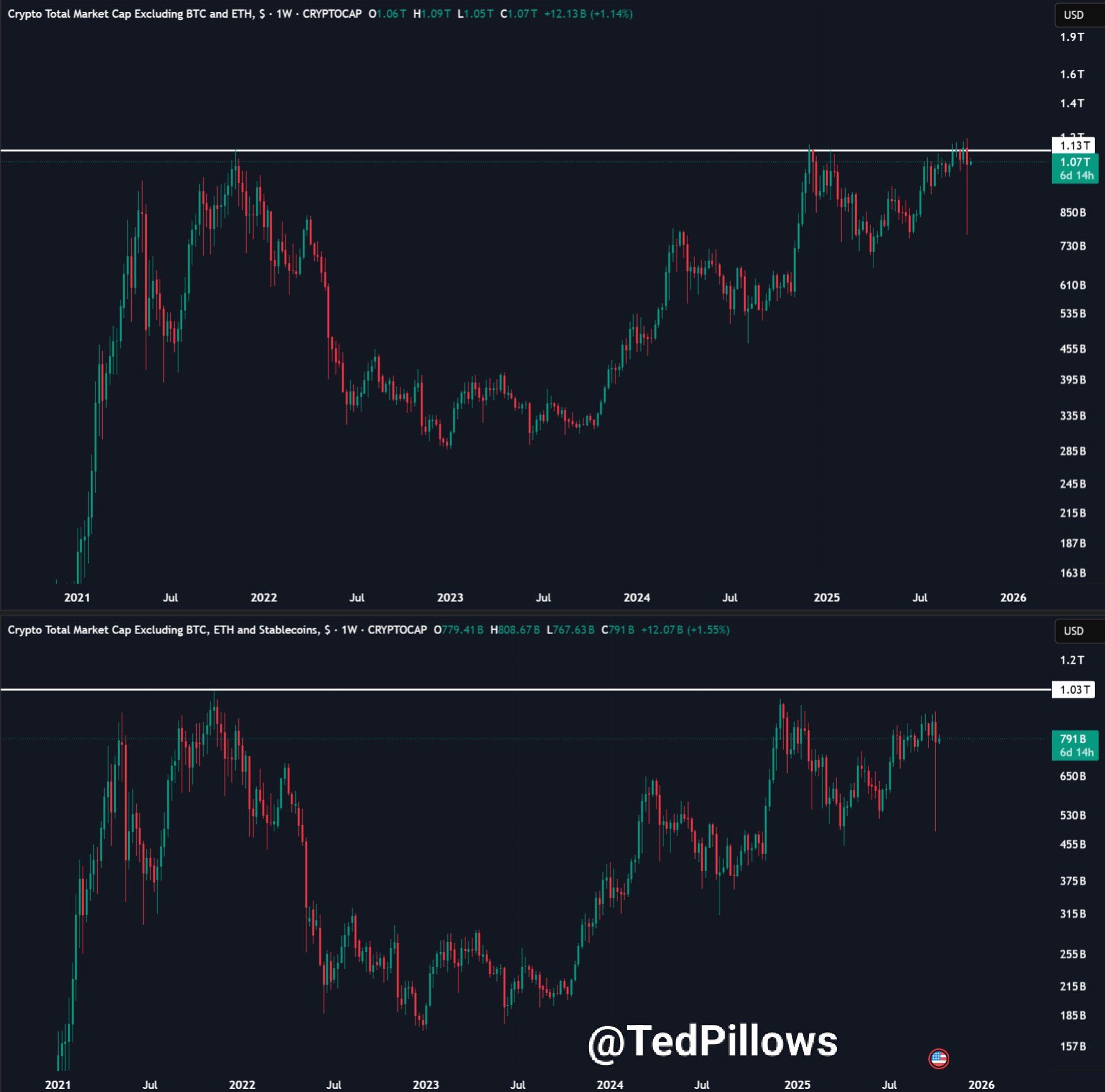 Analist Ted benadrukte — in lijn met Cowens voorzichtige benadering — dat de markt zich officieel nog niet in ‘altcoin season’ bevindt. Historische data laat zien dat de marktkapitalisatie van altcoins (exclusief stablecoins) nog steeds ongeveer 20% onder de all-time high ligt. Dit suggereert dat zowel BTC als ETH eerst sterker momentum moeten laten zien voordat altcoins kunnen uitbreken.