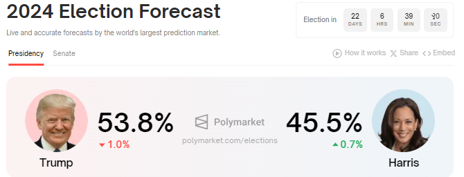 Duidelijke en ondersteunende crypto-beleidsmaatregelen zullen een krachtig instrument zijn voor elke kandidaat, Donald Trump of Kamala Harris, om zich een smalle weg naar de overwinning te banen. Polymarket-gegevens tonen aan dat gokkers Trump favoriseren, die een bijna 10% marge tegen Kamala Harris heeft.