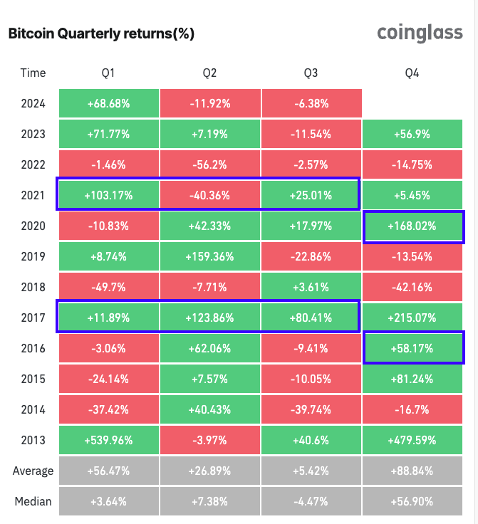 Bovendien was de koersactie van Bitcoin bullish van het eerste tot het derde kwartaal in de jaren na de halving—2017 en 2021.